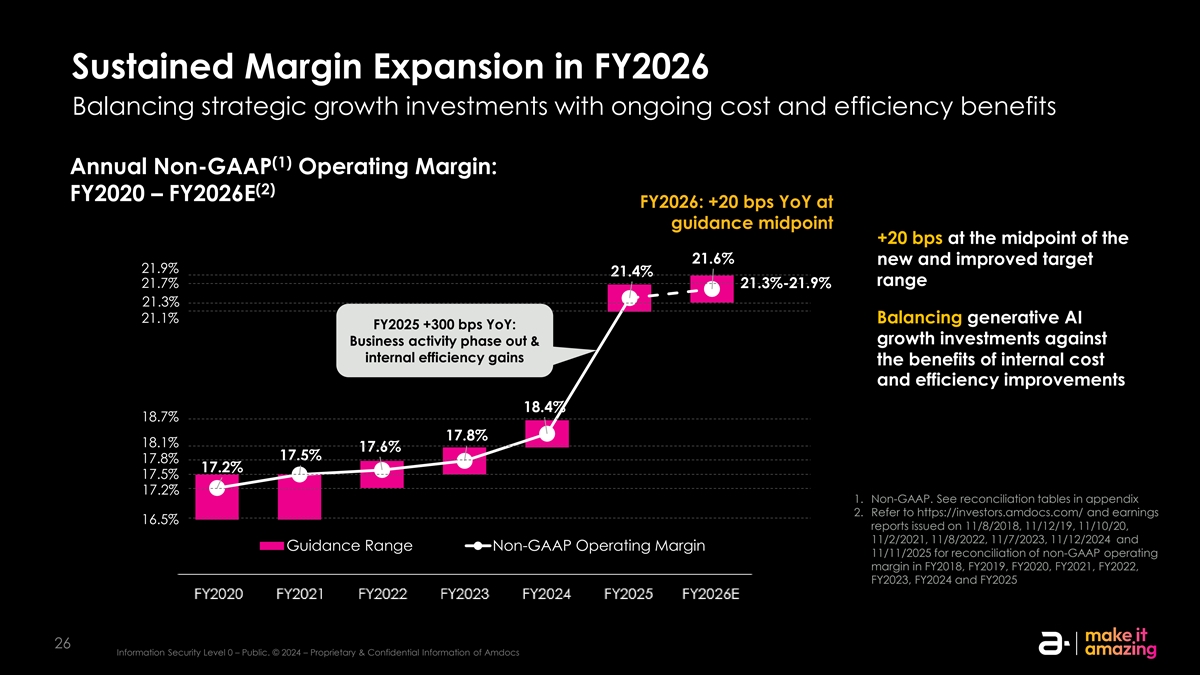 2026财年利润率持续扩张平衡战略增长投资与持续的成本和效率效益(1)年度非公认会计准则营业利润率:(2)2020财年– 2026财年:指引中点同比+ 20个基点新目标和改进目标21.9% 21.4%的中点同比+ 20个基点范围21.7% 21.3%-21.9 % 21.3% 21.1%平衡生成人工智能2025财年+ 300个基点同比:增长投资与业务活动的逐步淘汰和内部效率获得内部成本和效率改善的好处18.4% 18.7% 17.8% 18.1% 17.6% 17.5% 17.8% 17.2% 17.5% 17.2% 1。非公认会计原则。见附录2中的调节表。参考2018年11月8日、2019年11月12日、2019年11月10日、2021年11月2日、2022年11月8日、2023年11月7日、2024年11月12日、2024年11月12日和指导范围非公认会计原则营业利润率11/11/2025发布的https://investors.amdocs.com/和收益16.5%报告,以对2018财年、2019财年、2020财年、2021财年、2022财年、2023财年、2024财年和2025财年的非公认会计原则营业利润率进行调节26信息安全级0 –公开。©2024 – AMDOCs FY2020 FY2021 FY2022FY2023FY2024FY2025FY2026E的专有和机密信息
