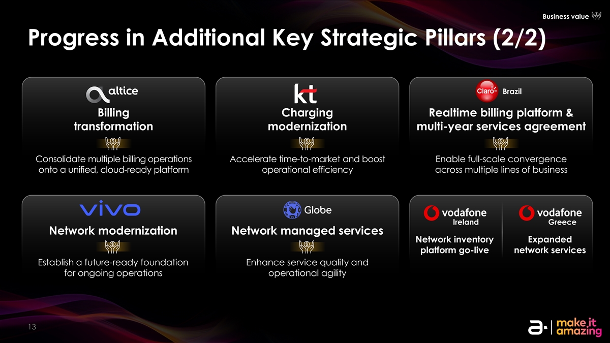 其他关键战略支柱的商业价值进展(1/2)墨西哥芬兰数字现代化数字BSS数字计划10年协议使B2C现代化多年期协议为其预付费和下一代数字BSS增强和扩展其数字销售能力后付费细分市场构建其Enhance自助服务体验移动平台具有先进的人工智能能力Tier2领先电信提供商多年IT服务协议5年BSS协议续签现代化和管理IT运营利用先进的BSS解决方案,同时支持更广泛的数字加速现代化并提供转型战略新的数字体验信息安全等级0–公共。©2025年公开。©2025 – AmDocs的专有和机密信息1212