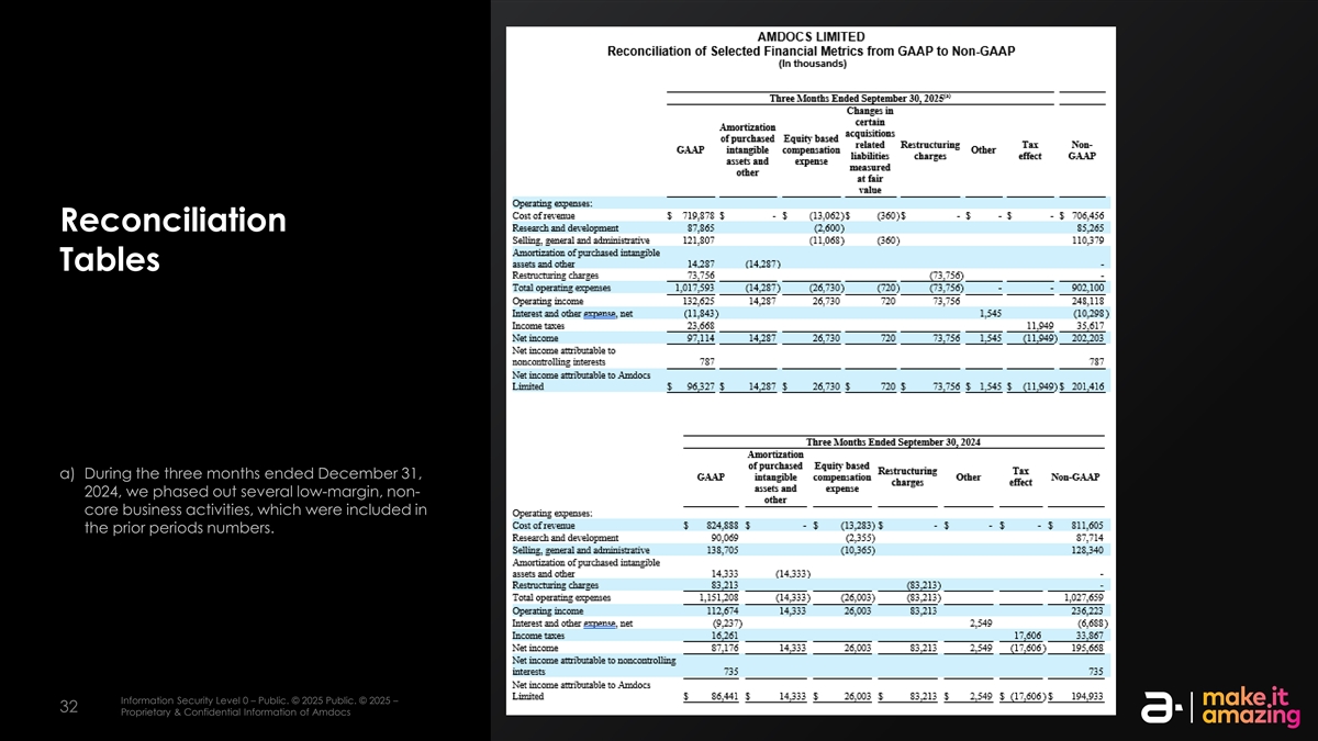 调节表a)在截至2024年12月31日的三个月内,我们逐步取消了几项低利润率、非核心业务活动,这些活动已包含在前期数字中。b)购买财产和设备项下的金额,净额”,包括所有期间出售财产和设备的非实质性收益。信息安全等级0–公开。©2025年公开。©2025 –信息安全0级–公。©2025年公开。©2025 – AmDocs的专有和机密信息3131 AmDocs的专有和机密信息