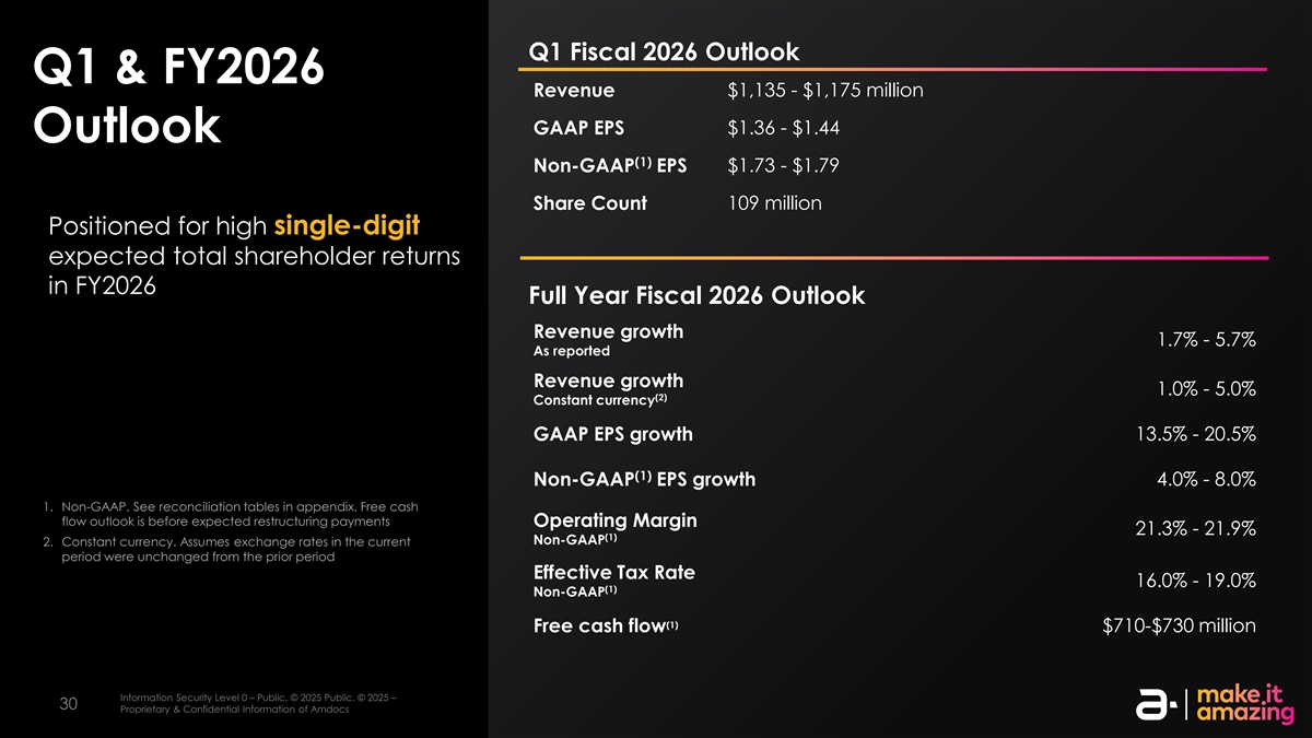 2026财年第一季度展望2026财年第一季度和2026财年营收$ 1,135-$ 11.75亿$ 1.36-$ 1.44 GAAP EPS Outlook(1)Non-GAAP EPS $ 1.73-$ 1.79股票计数1.09亿预计2026财年全年股东总回报高个位数2026财年展望收入增长1.7%-5.7%,因为报告的收入增长1.0%-5.0%(2)固定汇率13.5%-20.5% GAAP EPS增长(1)Non-GAAP EPS增长4.0%-8.0% 1。非公认会计原则。见附录中的调节表。自由现金流前景在预期重组付款前运营利润率21.3%-21.9%(1)Non-GAAP 2。不变的货币。假设本期汇率与上一期持平有效税率16.0%-19.0 %(1)非公认会计原则(1)自由现金流7.10-7.3亿美元信息安全0级–公开。©2025年公开。©2025 –信息安全0级–公。©2025年公开。©2025 – AMDOCs的专有和机密信息3030 AMDOCs的专有和机密信息