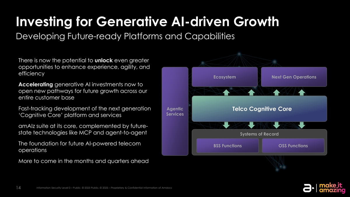 其他关键战略支柱的业务价值进展(2/2)巴西计费收费实时计费平台和转型现代化多年期服务协议巩固多项计费业务加速上市时间并推动实现跨多个业务线的统一、云就绪平台运营效率的全面融合爱尔兰希腊网络现代化网络托管服务网络库存扩展平台上线网络服务建立面向未来的基础增强服务质量和持续运营的运营敏捷性信息安全Level 0 – Public。©2025年公开。©2025 – AmDocs的专有和机密信息1313