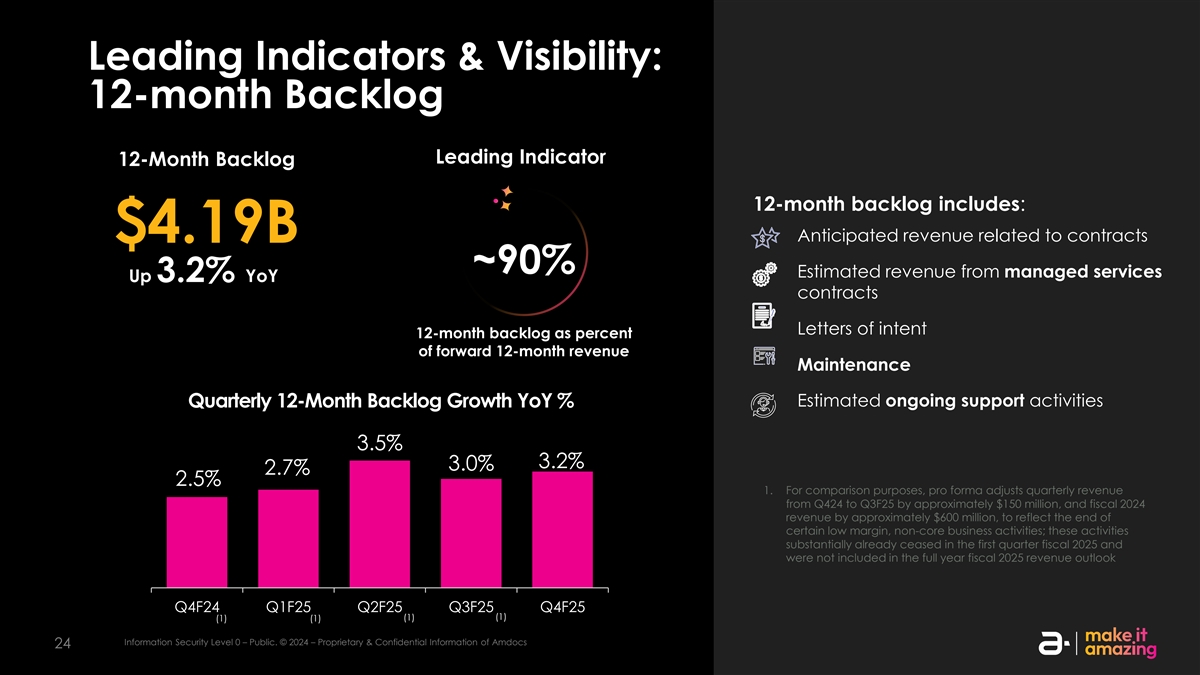领先指标&能见度:12个月积压领先指标12个月积压12个月积压包括:与合同相关的预期收入$ 4.19b~90%来自托管服务的估计收入同比增长3.2%合同意向书12个月积压占远期12个月收入的百分比维护估计正在进行的支持活动季度12个月积压增长同比% 3.5% 3.2% 3.0% 2.7% 2.5% 1。为便于比较,备考将Q424至Q3F25的季度收入调整约1.5亿美元,将2024财年的收入调整约6亿美元,以反映某些低利润率、非核心业务活动的结束;这些活动在2025财年第一季度基本上已经停止,并且不包括在2025财年全年收入展望Q4F24 Q1F25 Q2F25 Q3F25 Q4F25(1)(1)(1)(1)信息安全Level 0 – Public。©2024 – AmDocs 24的专有和机密信息