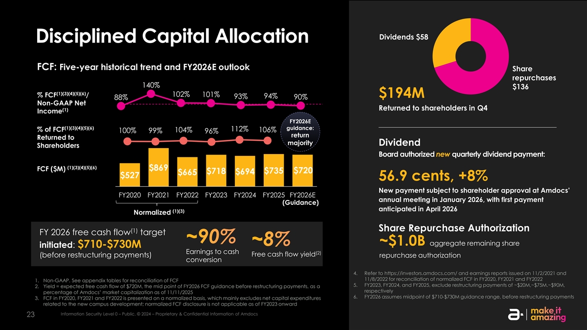 股息$ 58有纪律的资本分配FCF:五年历史趋势和FY2026E前景股票回购140% $ 136(1)(3)(4)(5)(6)102%%丨FCF丨/101% $ 1.94亿94% 93% 90% 88% Non-GAAP Q4净股东回报(1)收入FY2026E(1)(3)(4)(5)(6)指导:112%% FCF 104% 106% 100% 99% 96%回报大多数股息股东董事会授权新的季度股息支付:(1)(3)(4)(5)(6)$ 869 丨FCF($ M)$ 735 $ 720 $ 718 $ 694 $ 665 $ 52756.9美分,+预计2026年4月首次付款(指导)(1)(3)正常化股份回购授权(1)2026年财政年度自由现金流目标~1.0B美元总剩余股份启动:7.10-7.3亿美元收益变成现金(2)自由现金流收益率(重组付款前)回购授权转换4。请参阅https://investors.amdocs.com/和发布于2021年11月2日和2022年11月8日的收益报告,了解2020财年、2021财年和2022财年正常化FCF的调节情况1。非公认会计原则。FCF 5的调节见附录表格。2023财年、2024财年和2025财年,不包括约2000万美元、约7500万美元的重组付款。约9000万美元,2。收益率=预期自由现金流7.2亿美元,为2026财年重组付款前FCF指引的中点,分别占截至2025年11月11日AMDOCs市值的百分比6。2026财年假设中点为7.10-7.3亿美元的指导区间,重组付款前3。2020财年、2021财年和2022财年的FCF是在标准化基础上列报的,其中主要不包括与新校区开发相关的净资本支出;自2023财年起,标准化的FCF披露不适用于信息安全0级–公。©2024 – AMDOCs 23的专有和机密信息