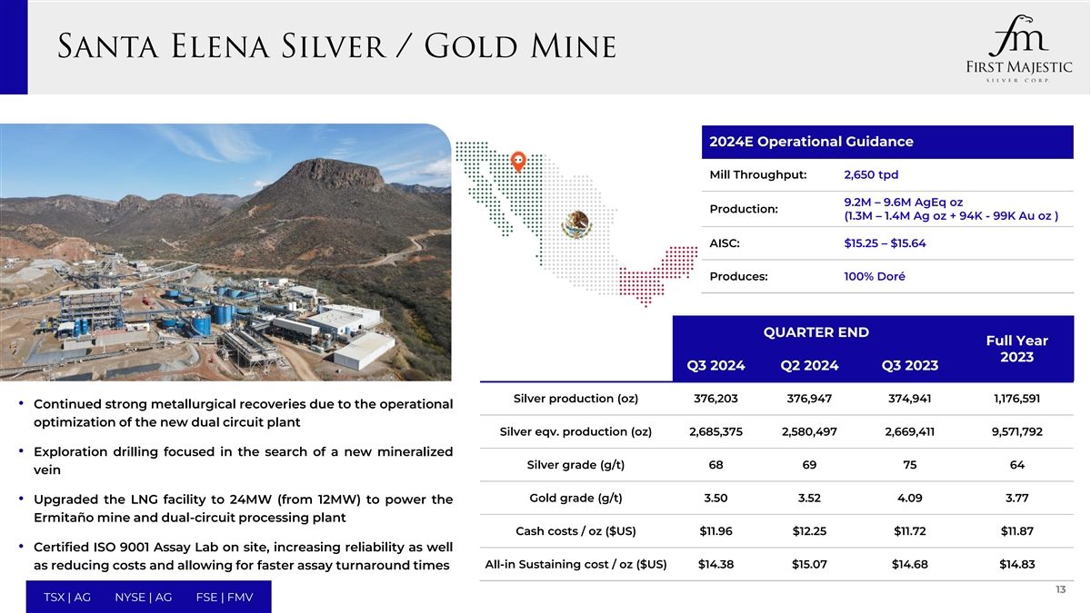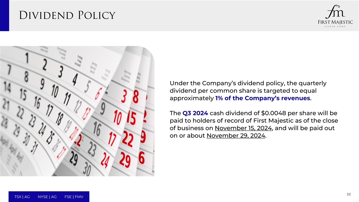 根据公司的股息政策,每普通股的季度股息目标约等于公司收入的1%。2024年第三季度现金股息为每股0.0048美元,将支付给截至2024年11月15日营业结束时登记在册的First Majestic持有人,并将于2024年11月29日或前后支付。22 TSX | AG NYSE | AG FSE | FMV