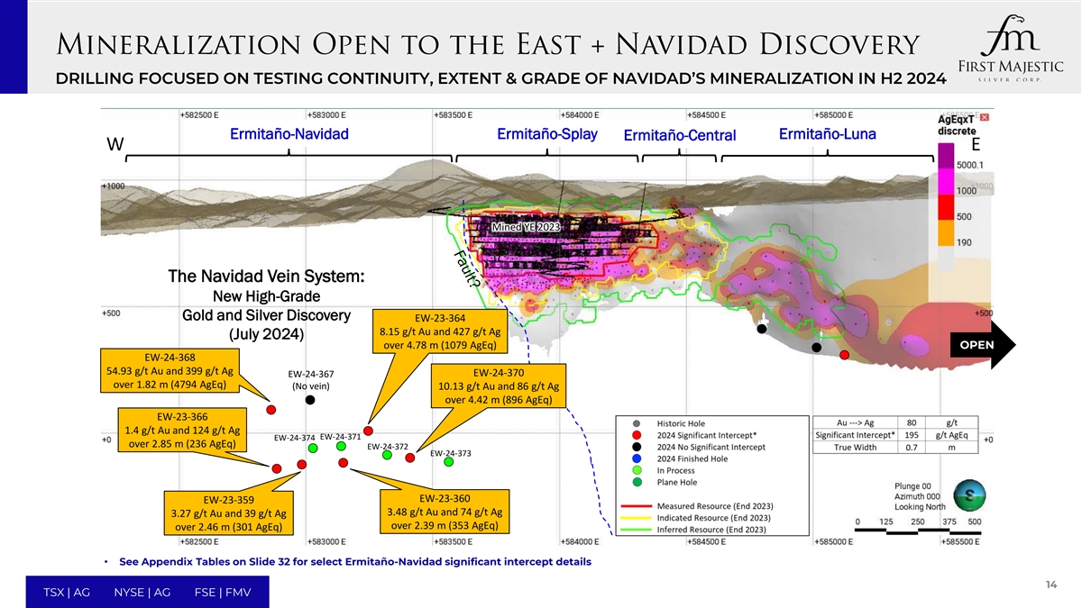钻探侧重于测试连续性,2024年下半年NAVIDAD矿化程度&等级Ermita ñ o-Navidad Ermita ñ o-Splay Ermita ñ o-Luna Ermita ñ o-Central W E开采YE 2023的NAVIDAD静脉系统:新的高品位金银发现EW-23-364 8.15 g/t Au和427 g/t Ag(2024年7月)超过4.78 m(1079 ageq)OPEN EW-24-368 54.93 g/t Au和399 g/t Ag EW-24-370 EW-24-367超过1.82 m(4794 ageq)(无静脉)10.13 g/t Au和86 g/t Ag超过4.42 m(896 ageq)EW-23-366 1.4 g和74 g/t Ag 3.27 g/t Au和39 g/t Ag over 2.39 m(353 agEq)over 2.46 m(301 agEq)•有关选定的Ermita ñ o-Navidad显着截距详细信息,请参见幻灯片32上的附录表格14 TSX | AG NYSE | AG FSE | FMV