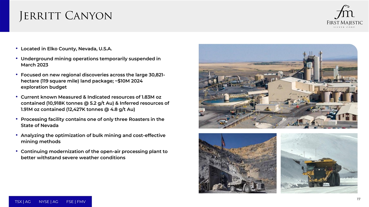 •位于内华达州埃尔科县,美国•地下采矿作业于2023年3月暂时暂停•重点关注占地30,821公顷(119平方英里)的大型一揽子土地上的新区域发现;约1000万美元的2024年勘探预算•目前已知的测量和指示资源量为183万盎司(10,918K吨@5.2克/吨金)和推断资源量为191万盎司(12,427K吨@4.8克/吨金)•加工设施包含内华达州仅有的三个焙烧炉之一•分析大宗采矿的优化和具有成本效益的采矿方法•继续对露天加工厂进行现代化改造,以更好地抵御恶劣天气条件17 TSX | AG NYSE | AG FSE | FMV