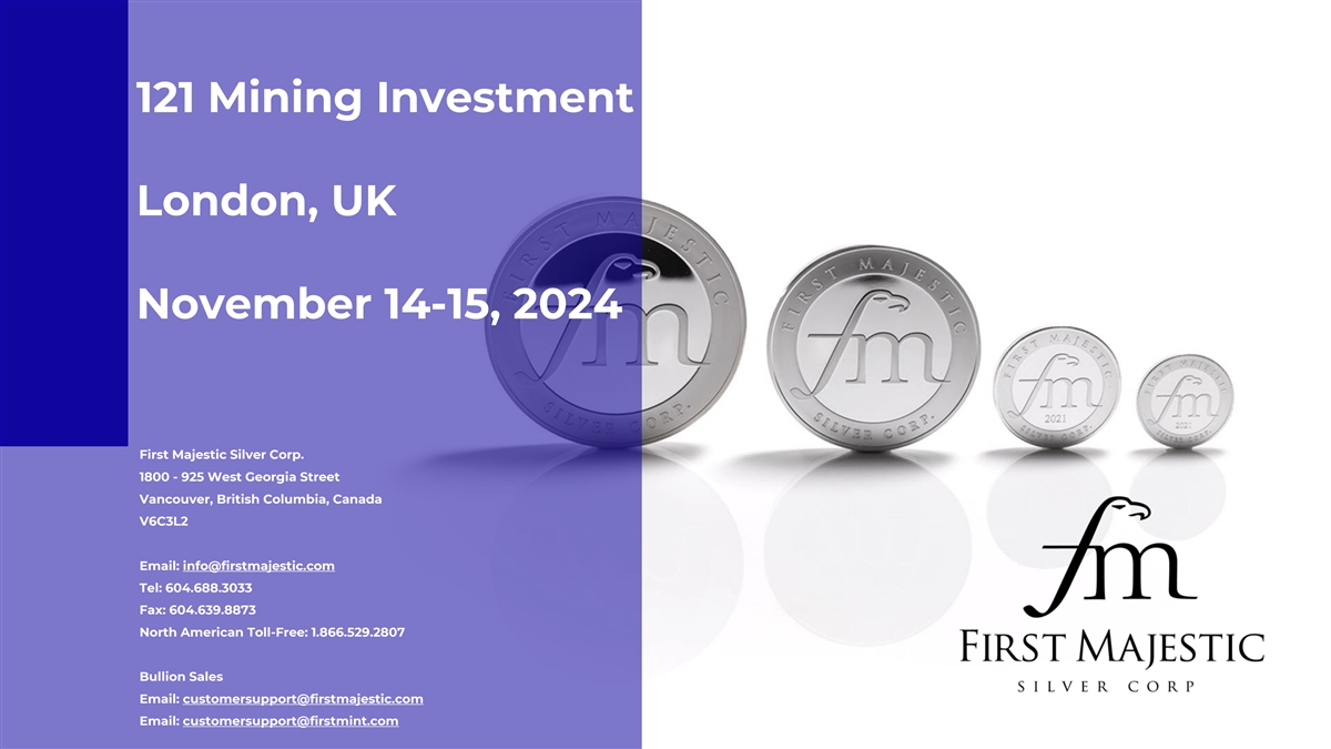 121矿业投资英国伦敦2024年11月14日至15日First Majestic Silver Corp. 1800-925 West Georgia Street Vancouver,British Columbia,Canada V6C3L2邮箱:info@firstmajestic.com电话:604.68 8.3033传真:604.639.88 73北美免费电话:1.8 66.52 9.2807金条销售邮箱:customersupport@firstmajestic.com邮箱:customersupport@firstmint.com
