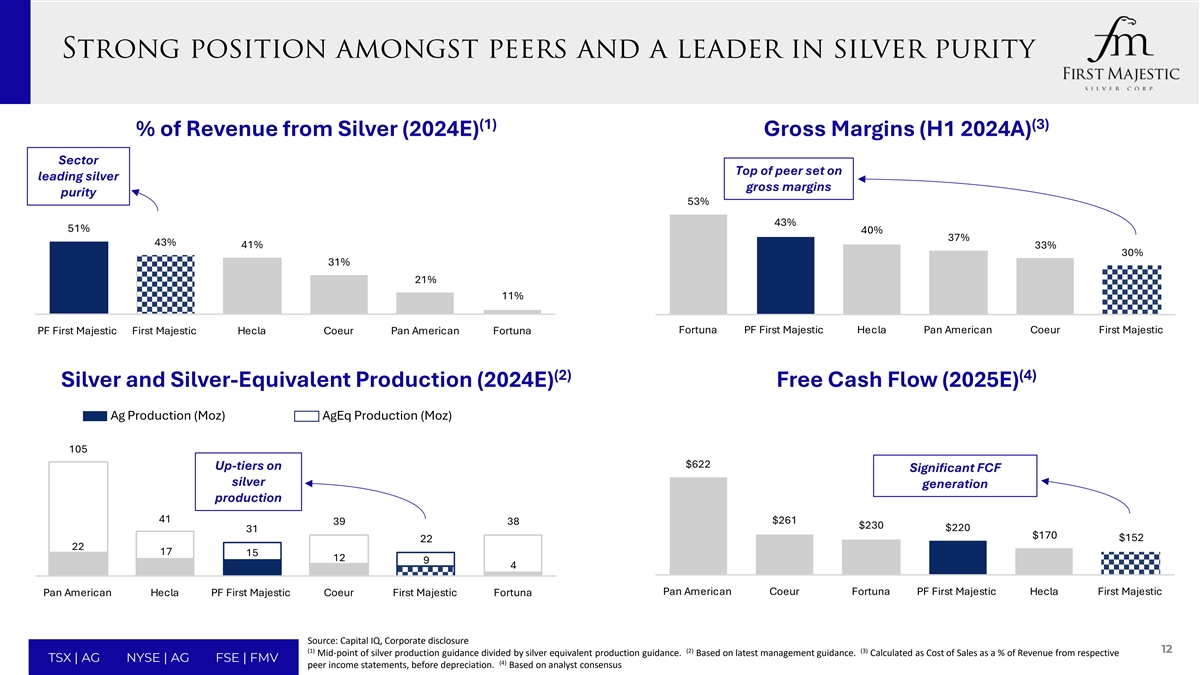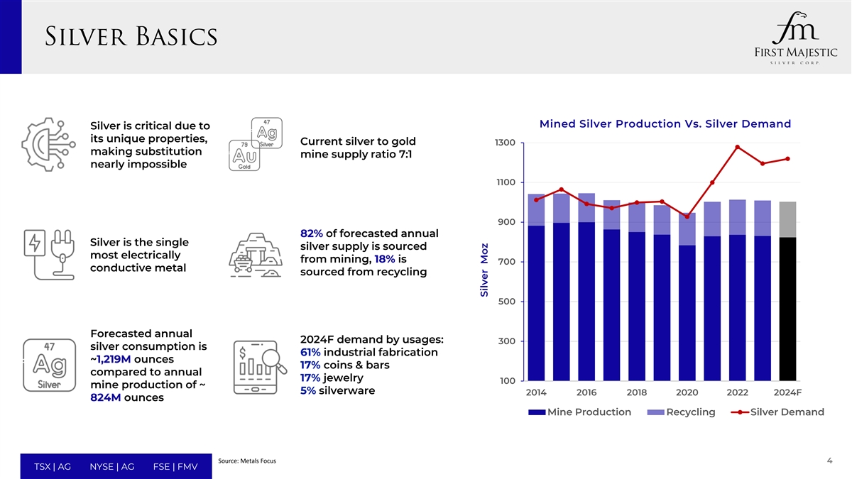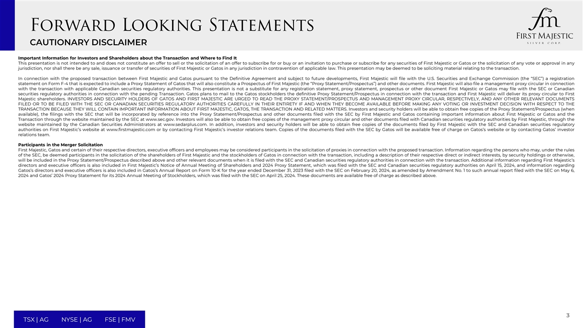 警示性免责声明投资者和股东关于交易的重要信息以及在何处可以找到本演示文稿无意也不构成出售要约或征求认购或购买要约或购买或邀请购买或认购First Majestic或Gatos的任何证券或在任何司法管辖区征求任何投票或批准,也不得在任何司法管辖区违反适用法律出售、发行或转让First Majestic或Gatos的证券。此演示文稿可被视为征求与交易有关的材料。关于First Majestic与Gatos根据最终协议进行的拟议交易,并视未来发展而定,First Majestic将向美国证券交易委员会(“SEC”)提交一份表格F-4的登记声明,该声明预计将包括Gatos的代理声明,该声明也将构成First Majestic的招股说明书(“代理声明/招股说明书”)和其他文件。First Majestic还将向适用的加拿大证券监管机构提交与交易有关的管理代理通知。本演示文稿不能替代First Majestic或Gatos可能向SEC或加拿大证券监管机构提交的与未决交易有关的任何注册声明、代理声明、招股说明书或其他文件。Gatos计划向Gatos股东邮寄与交易相关的最终委托书/招股说明书,First Majestic将向First Majestic股东递交其委托书通知。GATOS和First MAJESTIC的投资者和证券持有人被敦促分别阅读代理声明/招股说明书和管理代理通告,以及向SEC或加拿大证券监管机构提交或将提交的任何其他相关文件,如果这些文件在作出任何投票或投资决定之前以及在这些文件可获得时,请仔细阅读其全文投资者和证券持有人将能够通过SEC维护的网站www.sec.gov免费获得代理声明/招股说明书(如果有)、通过引用并入代理声明/招股说明书的向SEC提交的文件以及First Majestic和Gatos向SEC提交的其他文件,其中包含有关First Majestic或Gatos以及交易的重要信息。投资者还可以通过加拿大证券管理局维护的网站www.sedarplus.com免费获得First Majestic向加拿大证券监管机构提交的管理代理通知和其他文件的副本。此外,投资者和证券持有人将能够在First Majestic的网站www.firstmajestic.com上或通过联系First Majestic的投资者关系团队获得First Majestic向SEC和加拿大证券监管机构提交的文件的免费副本。GATOS向SEC提交的文件副本将在GATOS的网站上免费提供,或者联系GATOS的投资者关系团队。合并征集的参与者First Majestic、Gatos及其各自的某些董事、执行官和雇员可被视为与拟议交易有关的代理征集的参与者。根据SEC规则,可能被视为参与与交易相关的First Majestic股东和Gatos股东招揽的人员的相关信息,包括通过证券持有或其他方式对其各自直接或间接利益的描述,将在就交易向SEC和加拿大证券监管机构提交时,包含在上述代理声明/招股说明书和其他相关文件中。有关First Majestic董事和执行官的更多信息也包含在First Majestic于2024年4月15日向SEC和加拿大证券监管机构提交的年度股东大会通知和2024年代理声明中,有关Gatos董事和执行官的信息也包含在Gatos于2024年2月20日向SEC提交的截至2023年12月31日止年度的10-K表格年度报告中,该年度报告经5月6日向SEC提交的此类年度报告的第1号修正案修订,2024和Gatos2024年度股东大会的2024年代理声明,该声明于2024年4月25日提交给SEC。如上文所述,这些文件可免费获得。3 TSX | AG NYSE | AG FSE | FMV