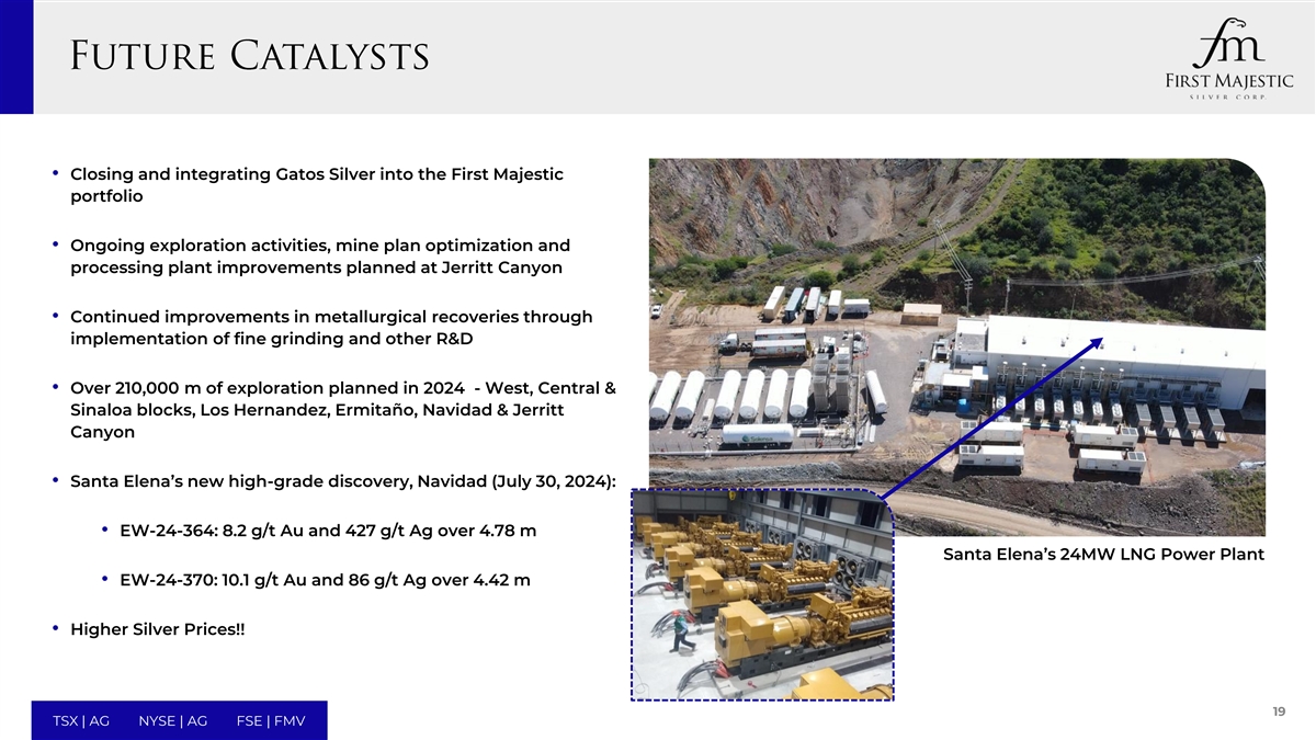 •关闭并将Gatos Silver整合到First Majestic投资组合中•正在进行的勘探活动、矿山计划优化和计划在Jerritt峡谷改进加工厂•通过实施精细研磨和其他研发,继续改善冶金回收率•计划在2024年进行超过210,000米的勘探-West、Central和Sinaloa区块、Los Hernandez、Ermita ñ o、Navidad和Jerritt峡谷• Santa Elena新的高品位发现Navidad(7月30日,2024):• EW-24-364:4.78 m Santa Elena 24MW LNG发电厂8.2 g/t Au和427 g/t Ag • EW-24-370:4.42 m以上10.1 g/t Au和86 g/t Ag •白银价格上涨!!19 TSX | AG NYSE | AG FSE | FMV