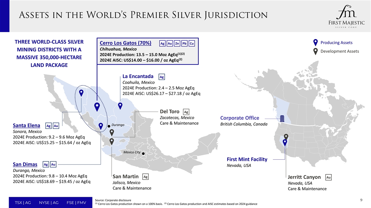交易亮点将墨西哥三个世界级、生产白银的矿区集中在一个旗帜下1 • Cerro Los Gatos(CLG)、San Dimas和Santa Elena共同为多元化、中间初级白银生产商提供了基础,提高了具有强劲利润率的生产概况2(1)•合并年产量为30-32Moz AgEq,包括15-16 Moz AG,总维持成本为18.00美元-20.00美元/盎司AgEQ支持自由现金流产生3(2)• Gatos预计将立即为合并后的实体贡献约7000万美元的年度自由现金流,利用经验丰富的合并团队在墨西哥创造价值方面有着良好的记录4 •在墨西哥运营超过20年的经验,重点是对社会负责的采矿,社区参与和价值创造对白银的敞口保持同行领先5(3)•超过50%的备考收入来自白银,而中间产银同行的平均占比约为30%,创造了一个35万公顷的极具前景的土地包,产生了勘探成功的历史6 • Cerro Los Gatos贡献了103,000公顷未设押和未充分开发的土地,具有显着的新发现潜力,在一家资产负债表得到加强、交易流动性领先和资本市场状况得到改善的较大公司中取得成果7 •备考市值接近3B美元,日均交易流动性约为4900万美元,并做好准备提供更高的股东价值实现有意义的协同效应8 •企业成本节约、供应链和采购效率、专业知识的交叉授粉以及内部项目和勘探计划的加速/优化,所有这些都有望为所有股东带来有意义的价值创造来源:Capital IQ,公司披露(1)基于First Majestic和Gatos2024年的生产指导,根据First Majestic金属价格假设进行调整,并按归属基础显示。全部维持成本或“AISC”是非GAAP(2)衡量标准。有关此类措施的进一步信息,请参阅各公司各自单独的公开披露。基于分析师对2024年的一致预期。自由现金流是一种非8(3)GAAP衡量标准。有关该措施的进一步信息,请参阅各公司各自单独的公开披露。基于白银产量指引中点除以白银TSX | AG NYSE | AG FSE | FMV当量产量指引。