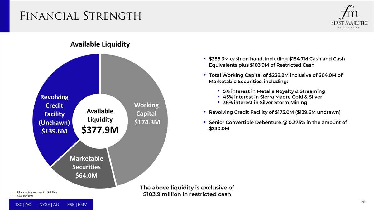 可用流动资金• 2.583亿美元的手头现金,包括1.547亿美元的现金和现金等价物加上1.039亿美元的受限现金•营运资金总额为2.382亿美元,其中包括6400万美元的有价证券,包括:• Metalla Royalty & Streaming的5%权益• Sierra Madre Gold & Silver Revolving的45%权益• Silver Storm Mining可用工作信贷的36%权益• 1.75亿美元的循环信贷(1.396亿美元未提取)资本融资流动性•高级可转换债券@0.375%,金额为1.743亿美元(未提取)2.30亿美元3.779亿美元1.396亿美元有价证券6400万美元以上流动性不包括•所有显示的金额均以1.039亿美元的受限制现金为单位•截至09/30/2420 TSX | AG NYSE | AG FSE | FMV