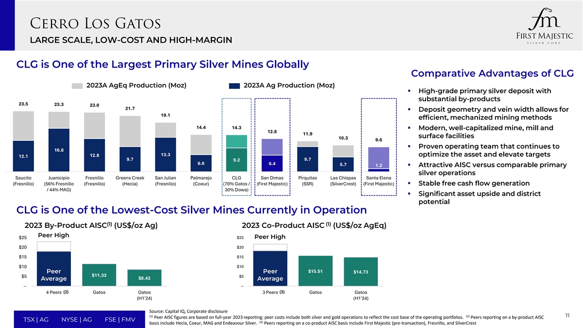 A tier 1 silver mine with robust exploration upside asset Key states ownership▪70% Gatos | 30% Dowa Metals & Mining Mine Type▪地下(1)银纯度▪64% throughput▪加速至+ 3,500吨/日▪7年基于目前确定的储量与矿山寿命延长矿山寿命的重大机会(2)2024年指导生产▪13.5 – 15.0 Moz AgEq(8.4 – 9.2 Moz Ag)2024年指南AISC▪14.00美元-16.00美元/盎司AgEq产品▪高含银PB和Zn精矿• CLG是一种规模可观、低成本的生产银资产,具有强大的勘探和开发潜力,自2019年以来运营的产量统计数据(实际– 100%基础)•在已建立的银区全年的关键地位2024年第一季度2024年第二季度• 2023年奇瓦瓦州拥有超过103,000公顷的矿权,这是一个极具前景且勘探不足的地区,拥有众多的银锌铅浅成热液矿化带AG Production(MOZ)9.2 Moz 2.4 Moz 2.3 Moz •拥有70%权益的区,拥有现代化的机械化地下AGEQ Production(MOZ)14.3 Moz 3.7 Moz 3.9 Moz运营AISC(US $/oZ)$ 15.51 $ 14.36 $ 15.26 •强大的合资伙伴,日本Dowa Metals & Mining Co.,Ltd(30%)10资料来源:公司披露TSX | AG NYSE | AG FSE | FMV(1)(2)按2023年Ag产量占2023年AgEQ产量的百分比计算。按100%基准显示