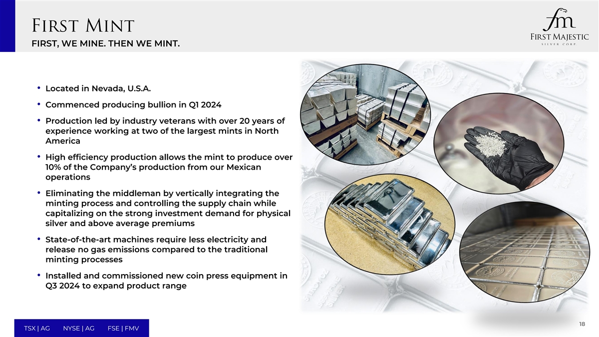 首先,我们是我的。然后我们造币。•位于内华达州,美国• 2024年第一季度开始生产金条•由在北美两家最大铸币厂工作超过20年经验的行业资深人士领导的生产•高效率生产使铸币厂能够从我们的墨西哥业务中生产公司产量的10%以上•通过垂直整合铸造过程和控制供应链消除中间商,同时利用对实物白银的强劲投资需求和高于平均水平的溢价•与传统铸造工艺相比,最先进的机器需要更少的电力并且不会释放气体•安装并于2024年Q3启用新的压币机设备以扩大产品范围18 TSX | AG NYSE | AG FSE | FMV