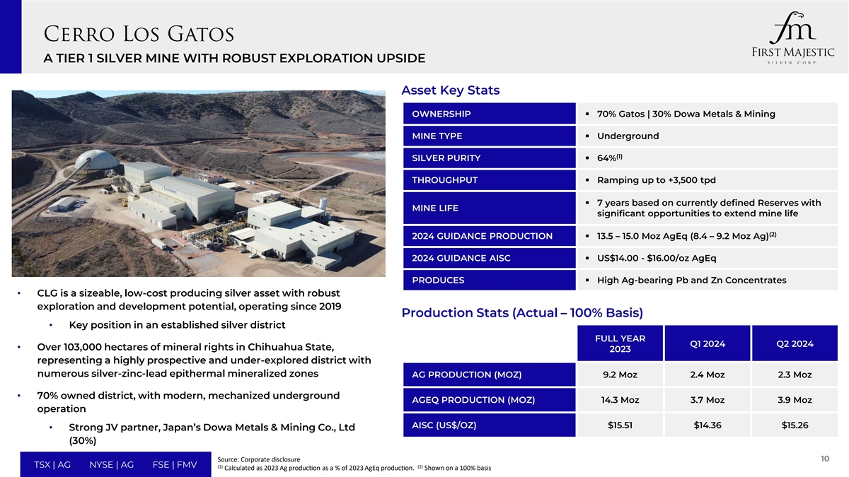 三大世界级白银生产资产Cerro Los Gatos(70%)AG Au Zn Pb Cu Chihuahua,Mexico Mining Districts with a(1)(2)2024e产量:13.5 – 15.0 Moz AGEQ MASSIVE 350,000-HECTARE(2)2024e AISC:14.00美元– 16.00美元/盎司AGEQ LAND PACKAGE La Encantada AG Coahuila,Mexico Durango Santa Elena AG Au Sonora,墨西哥2024E产量:9.2 – 9.6Moz AgEQ 2024E AISC:15.25美元– 15.64美元/盎司AgEQ墨西哥城第一铸币厂Ag Au San Dimas Nevada,USA Durango,Mexico 2024E产量:9.8 – 10.4Moz AgEQ AG San Martin Jerritt Canyon Au 2024E AISC:18.69美元– 19.45美元/盎司AgEQ Jalisco,Mexico Nevada,USA Care & Maintenance Care & Maintenance资料来源:公司披露9 TSX | AG NYSE | AG FSE | FMV(1)(2)Cerro Los Gatos产量按100%基准显示。基于2024年指导的Cerro Los Gatos产量和AISC估计