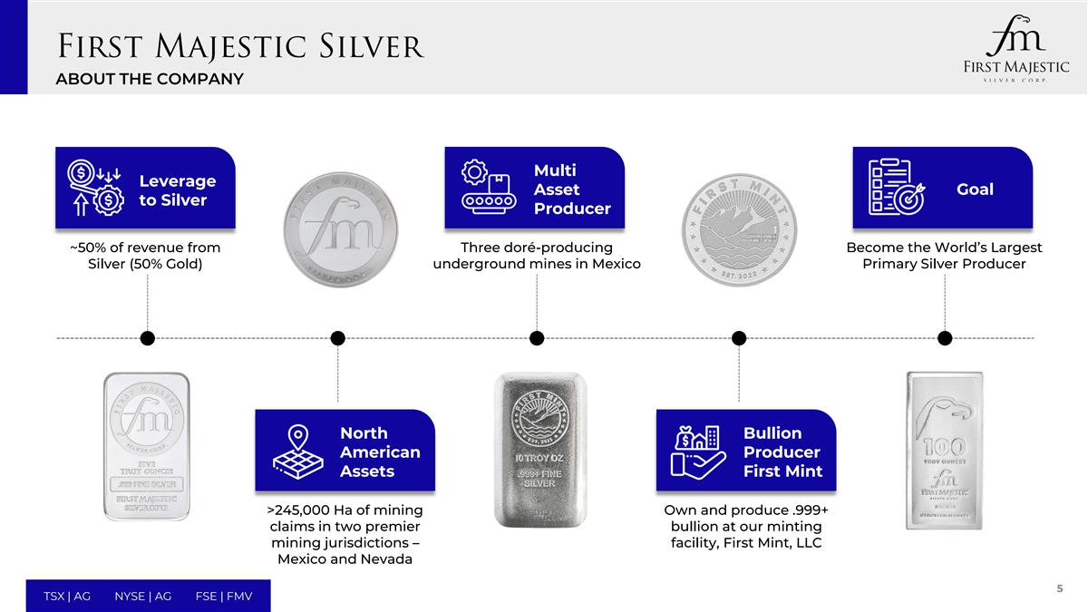 关于公司对白银生产商的多杠杆资产目标~50%的收入来自三个dor é-生产成为墨西哥世界上最大的白银(50%黄金)地下矿山初级白银生产商North Bullion American Producer Assets First Mint > 24.5万公顷的采矿拥有并在我们的铸造采矿管辖区的两个主要金条中生产.999 +的索赔-设施,First Mint,LLC墨西哥和内华达州5 TSX | AG NYSE | AG FSE | FMV