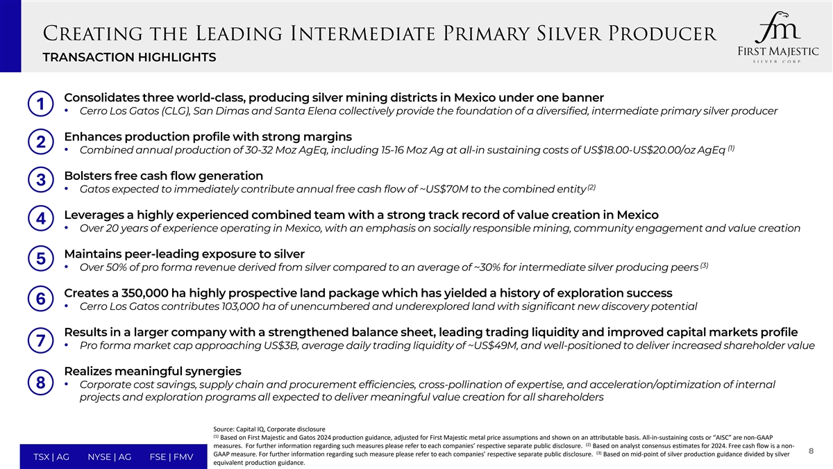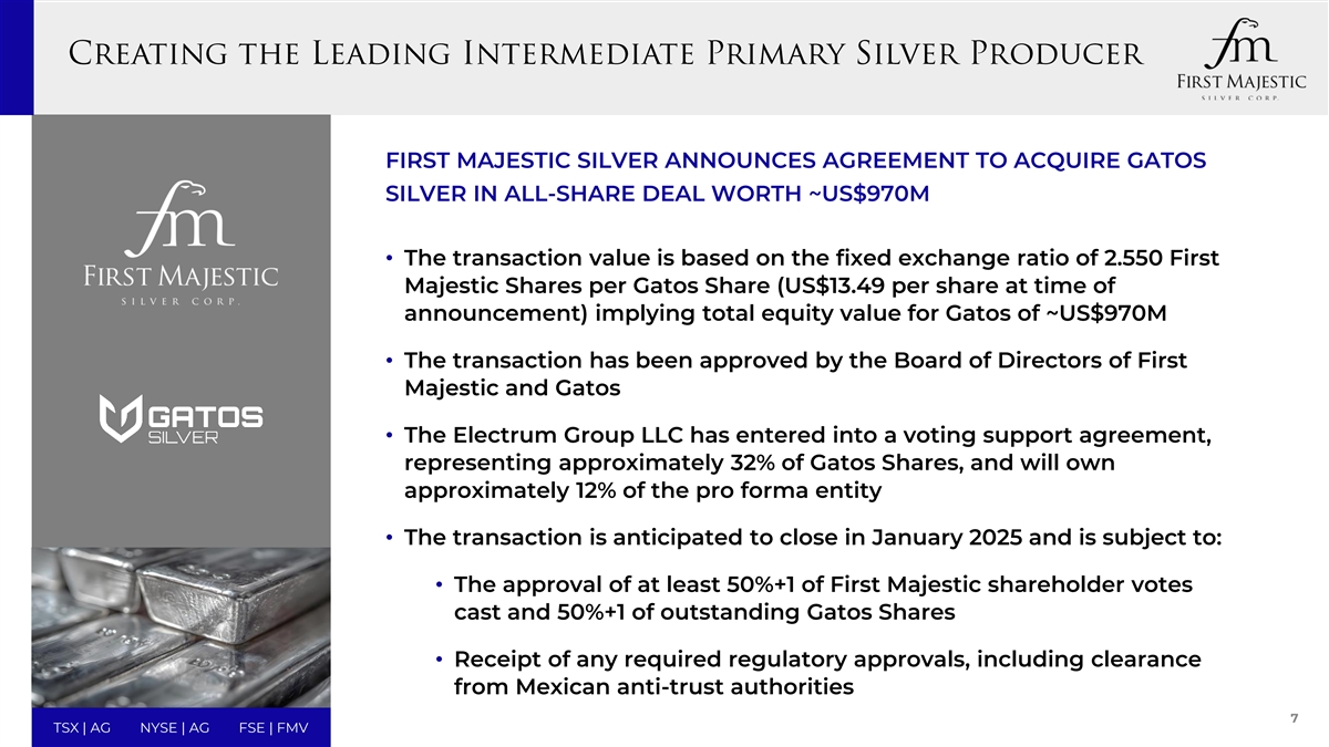 First Majestic Silver宣布同意以全部股份收购GATOS Silver,交易价值约9.7亿美元•交易价值基于每股GATOS股份2.550股First Majestic股份(公告时每股13.49美元)的固定交换比率,意味着GATOS的总股权价值约为9.7亿美元•该交易已获得First Majestic和GATOS董事会的批准• Electrum Group LLC已签订投票支持协议,代表GATOS股份约32%,并将拥有备考实体约12%的股份•该交易预计将于2025年1月完成,并受制于:• First Majestic股东至少50% + 1的投票和50% + 1的已发行Gatos股份的批准•收到任何必要的监管批准,包括墨西哥反垄断机构的批准7 TSX | AG NYSE | AG FSE | FMV