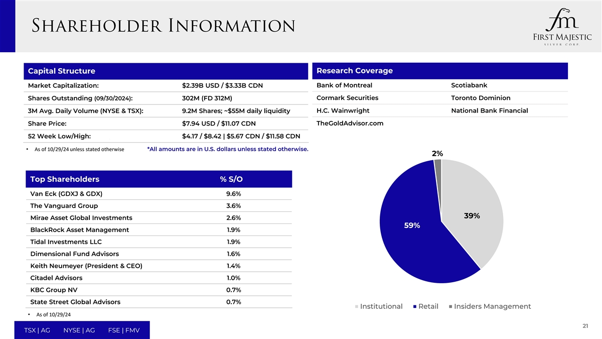 资本Structure研究覆盖范围蒙特利尔银行丰业银行市值:$ 2.39B USD/$ 3.33B CDN Cormark Securities流通股(09/30/2024):3.02亿(FD3.12亿)Toronto Dominion 3M Avg。每日成交量(NYSE & TSX):920万股;~5500万美元每日流动性H.C. Wainwright National Bank Financial股价:7.94美元/11.07加元TheGoldAdvisor.com 52周低/高:4.17美元/8.42美元| 5.67加元/11.58加元•截至10/29/24,除非另有说明*除非另有说明,所有金额均以美元为单位。2%最大股东% S/O Van Eck(GDXJ & GDX)9.6% 领航集团 3.6% 39% Mirae Asset Global Investments 2.6% 59% 贝莱德 Asset Management 1.9% Tidal Investments LLC 1.9% Dimensional Fund Advisors 1.6% Keith NeumeyerTERM5(总裁兼首席执行官)1.4% Citadel Advisors 1.0% KBC Group NV 0.7% 道富 Global Advisors 0.7% Institutional Retail Insiders Management •截至10/29/2421 TSX | AG NYSE | AG FSE | FMV