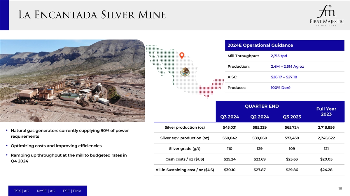2024E运营指导轧机吞吐量:2,300 tpd 9.8m – 1,040万ageq oz产量:(5.2m – 5.5m Ag oz + 56k – 59k Au oz)AISC:$ 18.69 – $ 19.45产量:100% Dor é季度末全年2023 Q3 2024 Q2 2024 Q3 2023银产量(oz)1,046,3401,9061,548,2036,355,308 •超过50%的电力需求由环境清洁提供,低成本水电白银当量产量(oz)2,110,9052,114,0723,010,45812,789,920 •重点改善长孔银品位(g/t)的稀释控制188210237240回采和切割和填充,以提高头部品位• 2024年勘探预算是自资产金品位(g/t)2.12 2.15 2.71 2.85收购以来最大的一次。焦点集中在西部Block“,那里的几个现金成本/盎司(美元)16.50美元16.66美元14.07美元12.51美元地区最突出的生产商正朝着这个方向发展All-in Sustaining cost/oz(美元)21.44美元21.78美元17.76美元16.48美元15 TSX | AG NYSE | AG FSE | FMV