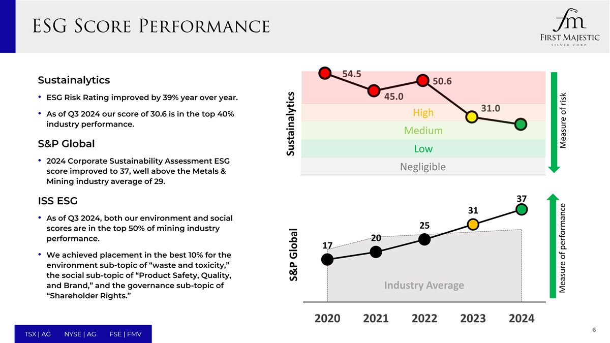 Sustainalytics • ESG风险评级同比提高39%。高•截至2024年第三季度,我们的得分为30.6,位于行业表现的前40%。中标普全球低• 2024年企业可持续发展评估ESG可忽略评分提高至37,远高于金属和采矿业平均29。37 ISS ESG 31 •截至2024年第三季度,我们的环境和社会25得分均位于采矿业表现的前50%。2017 •我们实现了“废物与毒性”环境子课题、“产品安全、质量、品牌”社会子课题、行业平均“股东权益”治理子课题的最优10%配售。202020212022202320246 TSX | AG NYSE | AG FSE | FMV Sustainalytics 标普全球绩效衡量风险衡量