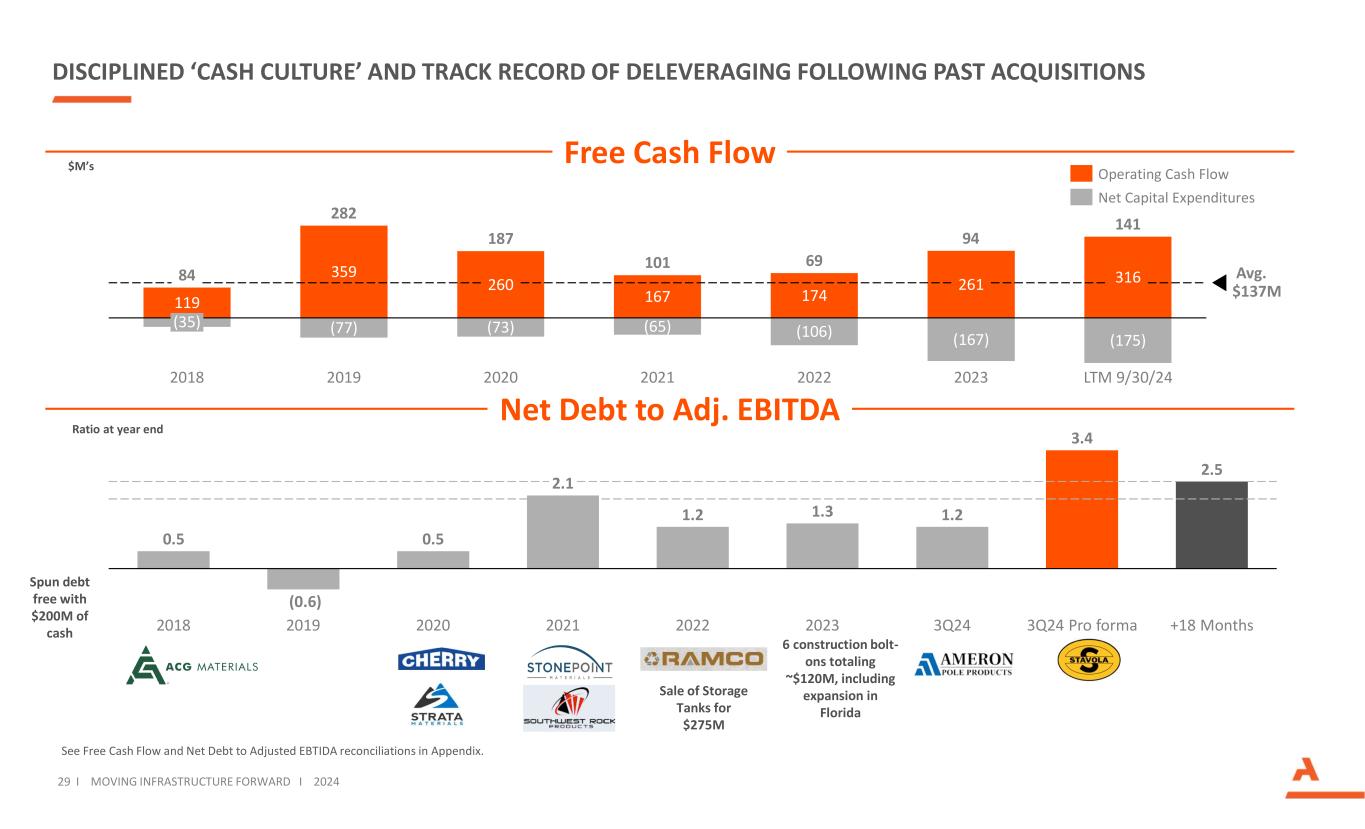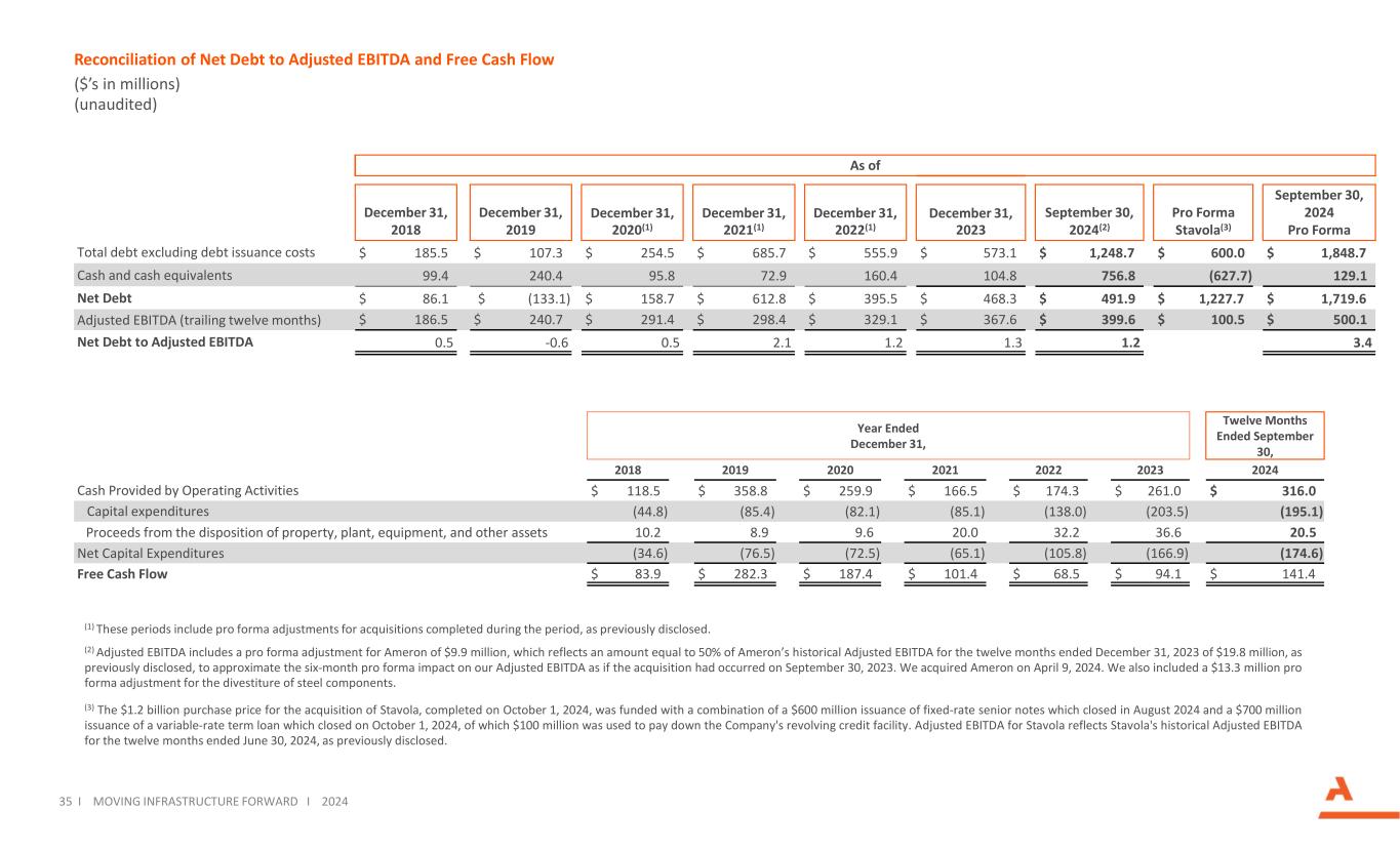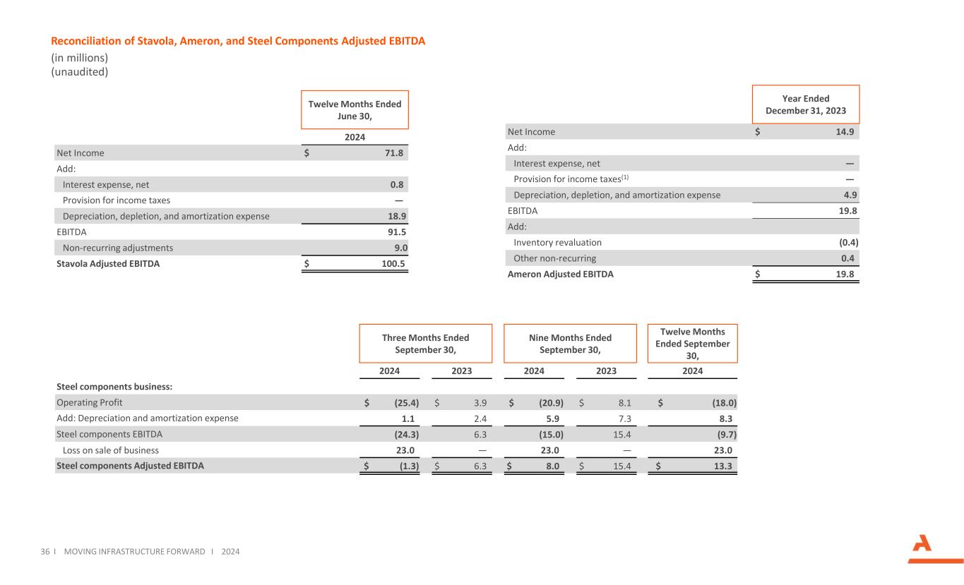 35将基础设施向前推进I将基础设施向前推进I 2024年净债务与调整后EBITDA和自由现金流的对账(百万美元)(未经审计)(1)如先前披露,这些期间包括在该期间完成的收购的备考调整。(2)调整后EBITDA包括对Ameron进行的990万美元的备考调整,这反映了之前披露的Ameron截至2023年12月31日的十二个月的历史调整后EBITDA 1980万美元的50%,以近似于对我们调整后EBITDA的六个月备考影响,就好像收购发生在2023年9月30日一样。我们在2024年4月9日收购了Ameron。我们还包括一项1330万美元的钢铁部件剥离的备考调整。(3)收购Stavola的12亿美元收购价于2024年10月1日完成,资金来自于2024年8月结束的6亿美元固定利率优先票据发行和2024年10月1日结束的7亿美元浮动利率定期贷款发行,其中1亿美元用于偿还公司的循环信贷额度。如先前披露,Stavola的调整后EBITDA反映了Stavola截至2024年6月30日的十二个月的历史调整后EBITDA。截至2024年9月30日备考Stavola(3)2024年9月30日(2)2023年12月31日2022年12月31日(1)2021年12月31日(1)2020年12月31日(1)2019年12月31日2018年12月31日1,848.7美元600.0美元1,248.7美元573.1美元555.9美元685.7美元254.5美元107.3美元185.5不包括债务发行成本的总债务129.1(627.7)756.8 104.81 60.47 2.99 5.82 40.499.4现金及现金等价物1,719.6美元1,227.7美元491.9美元468.3美元395.5美元612.8美元158.7美元(133.1)86.1美元净债务500.1美元100.5美元399.6美元367.6美元329.1美元298.4美元240.7美元186.5调整后EBITDA(过去12个月2024202320222021202020192018 $ 316.0 $ 261.0 $ 174.3 $ 166.5 $ 259.9 $ 358.8 $ 118.5经营活动提供的现金(195.1)(203.5)(138.0)(85.1)(82.1)(85.4)(44.8)资本支出20.5 36.63 2.22 0.09.68.9 10.2处置不动产、厂房、设备和其他资产的收益(174.6)(166.9)(105.8)(65.1)(72.5)(76.5)(34.6)净资本支出$ 141.4 $ 94.1 $ 68.5 $ 101.4 $ 187.4 $ 28 2.3 $ 83.9自由现金流