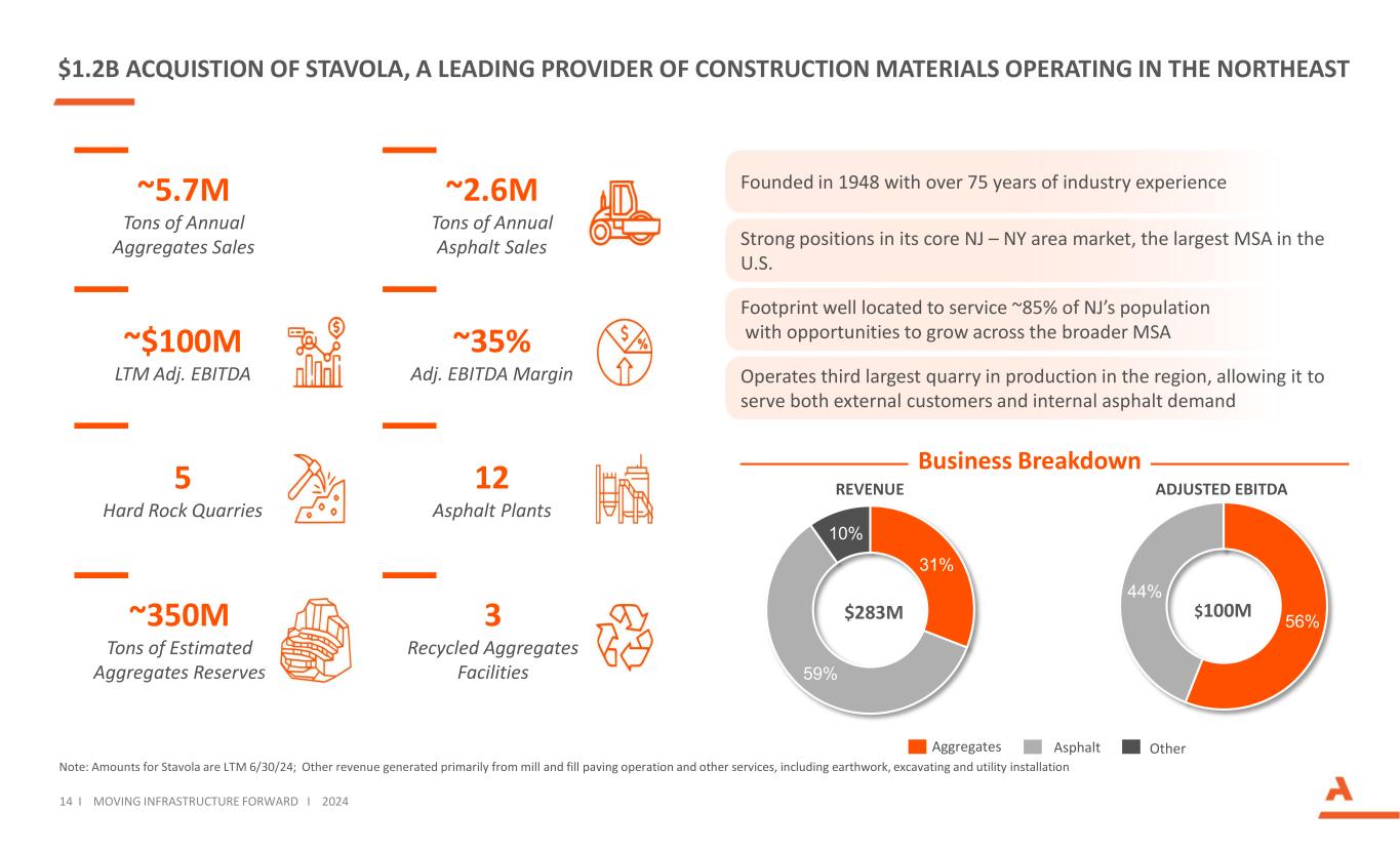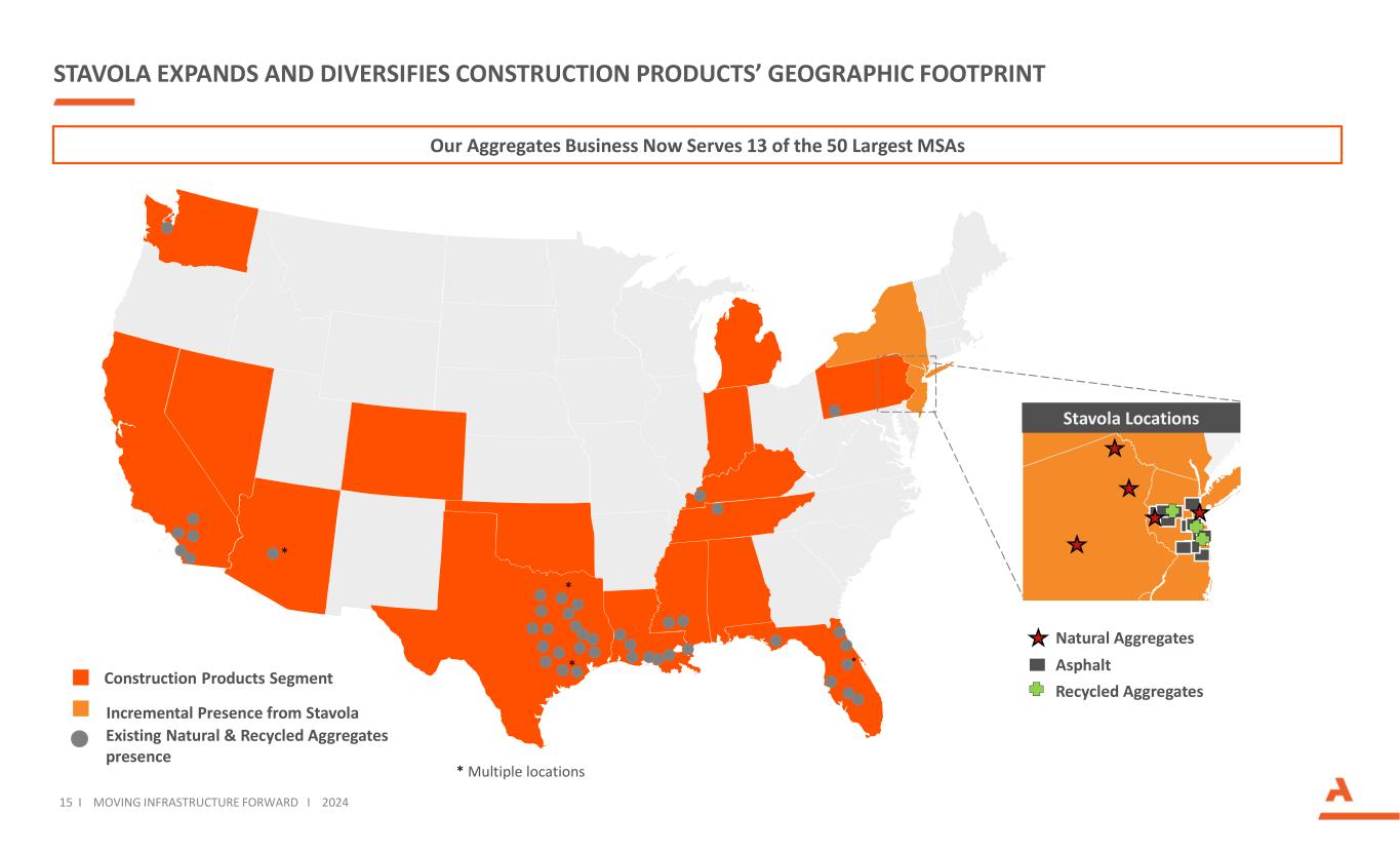 $ 1.2B收购Stavola,这是一家由NUMBERS Company HIGHLIGHTS在东北部运营的建筑材料的领先供应商,该公司经营着该地区生产中的第三大采石场,使其能够为外部客户和内部沥青需求提供服务,该公司成立于1948年,拥有超过75年的行业经验足迹,地理位置优越,能够为新泽西州约85%的人口提供服务,并有机会在其核心NJ – NY地区市场的更广泛的MSA稳固地位中实现增长,美国最大的MSA聚合沥青其他调整后EBITDA 14 i移动基础设施向前I2024年业务细目31% 59% 10% 2.83亿美元~1亿美元LTM调整后EBITDA~35% Adj. EBITDA利润率~570万吨年度骨料销量~260万吨年度沥青销量5硬岩采石场12沥青厂3再生骨料设施~3.5亿吨估计骨料储量注:Stavola的金额为LTM 6/30/24;其他收入主要来自磨料和填料摊铺作业以及其他服务,包括土方工程、挖掘和公用事业安装56% 44% 1亿美元收入