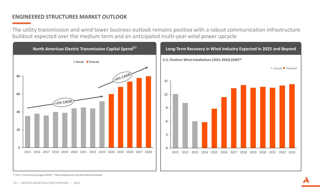 工程结构市场展望24 i推动基础设施向前发展i 2024(1)C三组(2024年8月);(2)Wood Mackenzie,2024年第三季度市场展望公用事业输电和风塔业务前景仍然乐观,预计中期内将有强劲的通信基础设施建设,预计2025年及以后将出现多年风电上行周期风能行业的长期复苏美国和加拿大电力传输总额:报告的CAPEX($ B)北美电力传输资本支出(1)美国总和加拿大电力传输:报告的资本支出($ B)020406080201520162017201820192020202120212022202320242025202620272028实际预测03691215202120222022202320242025202620272028202920292030203120322033美国陆上风电安装量(2021-2033)(GW)(2)实际预测
