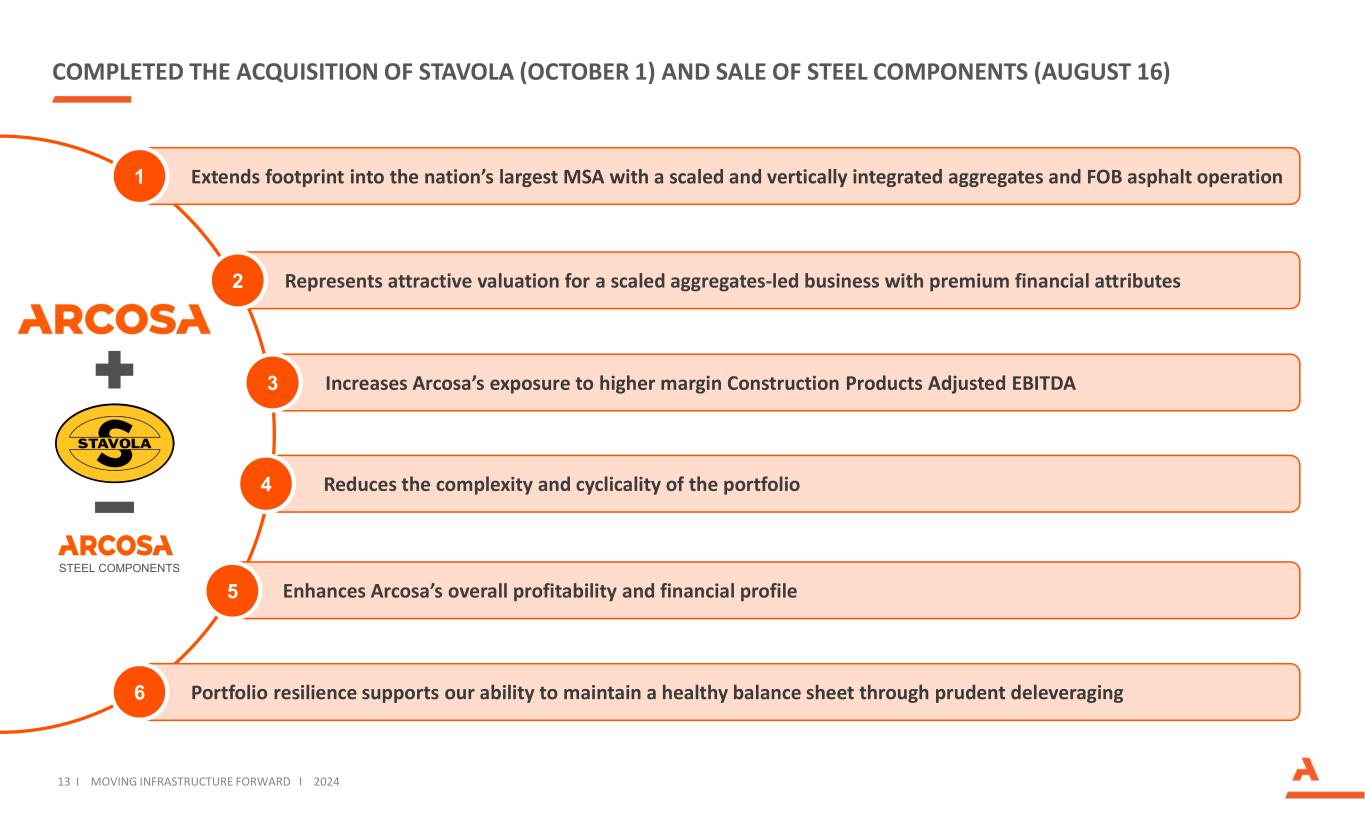 随着我们寻求扩大我们的增长平台,在建筑产品收购方面投资约27亿美元12 i moving infrastructure forward i 2024对我们的建筑产品平台的持续投资Q4 2024Q2 2022Q3 2021Q2 2021Q3 2021Q3 2020Q4 2018KEY acquisitions natural aggregates recycled aggregates离岸沥青再生aggregates natural aggregates natural aggregates recycled aggregates natural aggregates natural aggregates recycled aggregates natural aggregates specialty materials natural aggregates product line扩大对东北地区的敞口增加规模化和垂直的骨料和沥青业务进入南加州市场规模化进入和PA)扩大在德克萨斯州和海湾沿岸的存在扩大在DFW的存在增加对再生骨料的敞口扩大在休斯顿的存在进入再生骨料增加了互补的规模化平台多样化的客户基础和终端市场战略契合5活跃矿山3再生骨料设施12沥青厂4破碎地点6活跃矿山14活跃矿山5破碎地点1活跃矿山12地点24活跃矿山5生产设施地点数量12.00亿美元7500万美元1.5亿美元3.75亿美元8700万美元2.98亿美元315MPURCHASE价格10.7X(1)7.8X10.7X12.9X(1)8.5X8.1X9.8XPURCHASE骨料和特种材料的多个有吸引力的基本面●具有长期定价的有吸引力的市场和数量增长;比其他Arcosa业务的周期性更低●可持续的竞争优势,通过储备地位、许可证、产品组合、专有加工能力和深厚的市场知识●碎片化的行业结构,有能力以有吸引力的倍数购买中小型资产● Ability将收购用作未来有机和补强机会的增长平台(1)扣除税收优惠后的倍数显示