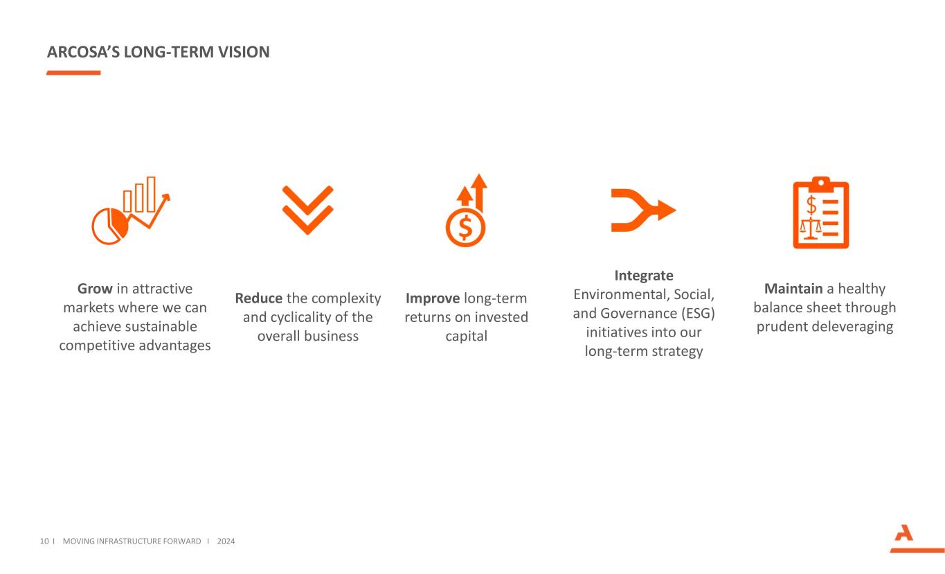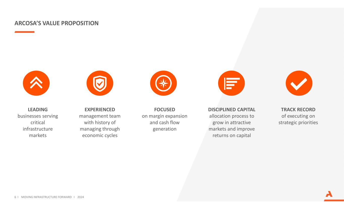 ARCOSA的价值建议侧重于利润率扩张和现金流产生经验丰富的管理团队,具有在经济周期中进行管理的历史,服务于关键基础设施市场的领先企业跟踪执行战略优先事项的记录,区分资本分配过程,以在有吸引力的市场中增长并提高资本回报率6 i推动基础设施向前发展i 2024
