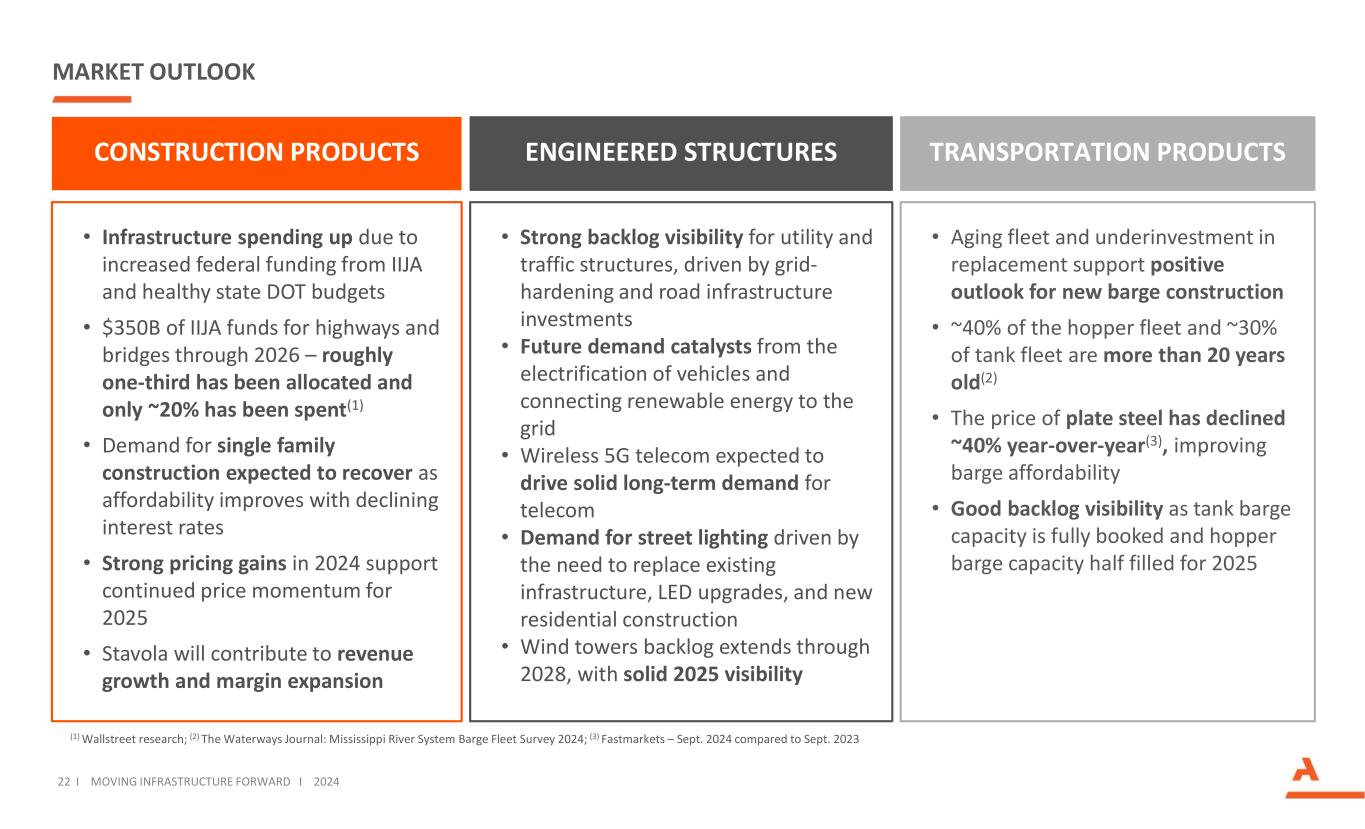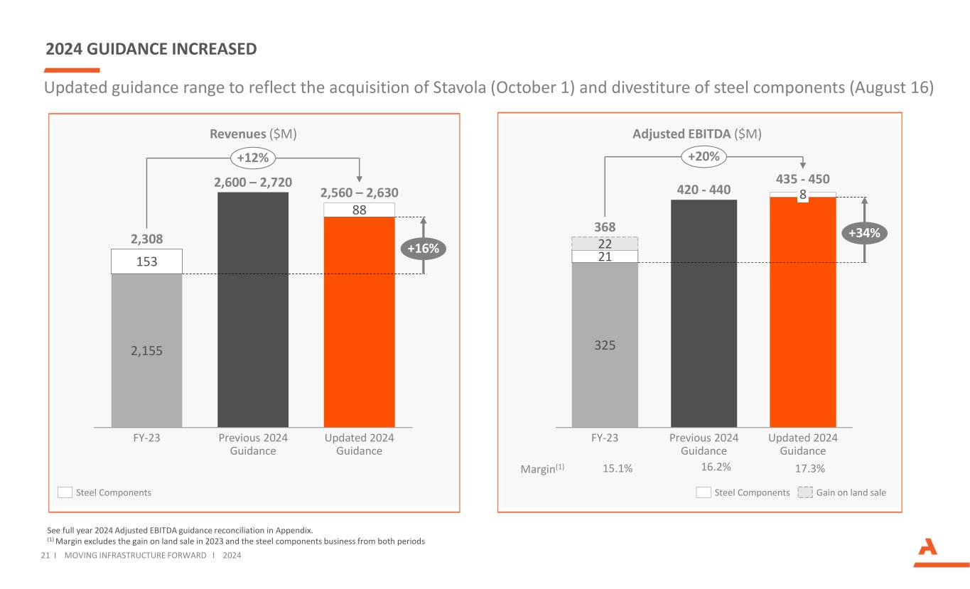 更新指导范围以反映收购Stavola(10月1日)和剥离钢铁部件(8月16日)见附录中的2024年全年调整后EBITDA指导调节。(1)利润率不包括2023年土地出售收益和两个时期的钢铁部件业务2024年指引增加3252122 FY-23先前2024年指引更新2024年指引368420-440435-4508 + 34% + 20%调整后EBITDA(百万美元)21 i移动基础设施向前i 2024年利润率(1)15.1% 16.2% 2,15515388 FY-23先前2024年指引更新2024年指引2,600 – 2,7202,560 – 2,6302,308 + 16% + 12%收入(百万美元)土地出售收益钢铁部件17.3%钢铁部件