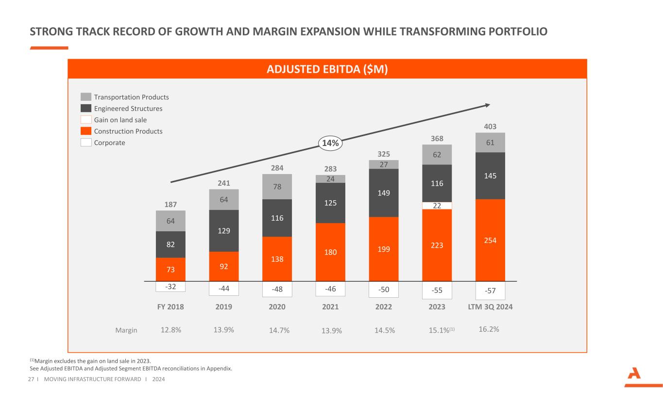 转型投资组合的同时增长和利润率扩张的强劲记录(1)利润率不包括2023年出售土地的收益。见附录中调整后EBITDA和调整后分部EBITDA对账。27 i移动基础设施转发i 202473921381801992232548212911612514922145646478242711661-32-44-48-46-50 62-57-55 FY 201820192020202120222023LTM Q3 202418724128428332536840314%调整后EBITDA(百万美元)运输产品工程结构建筑产品公司土地销售利润率12.8% 16.2% 13.9% 14.7% 13.9% 14.5% 15.1%(1)