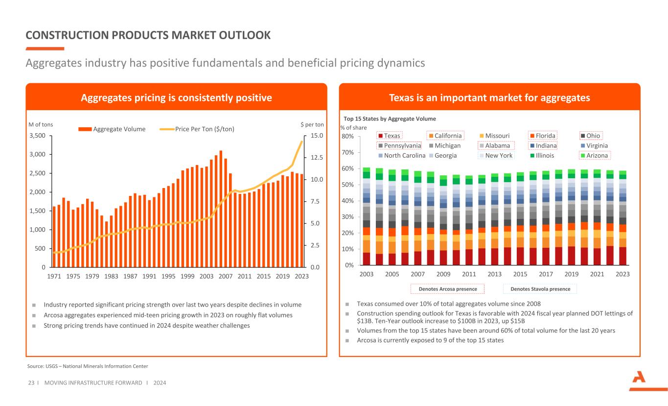 建筑产品市场展望23 i动基础设施向前i2024资料来源:USGS –国家Minerals信息中心骨料行业基本面向好和有利的定价动态德克萨斯州是骨料的重要市场骨料定价一直是积极的■行业报告称,尽管销量下降,但过去两年定价表现出显着优势■ Arcosa骨料在2023年经历了中等价位的定价增长,销量大致持平■尽管存在天气挑战,但2024年仍延续了强劲的定价趋势,按总量排名前15的州■自2008年以来,德克萨斯州消耗的骨料总量超过10% ■德克萨斯州的建筑支出前景看好,2024财年计划的DOT租赁为13B美元。2023年十年展望增至$ 100B,上涨$ 15B ■前15个州的成交量约占总成交量的60%最近20年■ Arcosa目前接触的前15个州中的9个州0.0 2.55.07.5 10.01 2.5 15.005001,0001,5002,0002,0002,5003,0003,5003,500197119751979198319871987 1991 1995199519952003200320072011201520192023每吨总容积价格(美元/吨)0% 10% 20% 30% 40% 50% 60% 70% 80% 200320052005200720092011201320152017201920212023 Texas California Missouri Florida Ohio Pennsylvania Michigan Alabama Virginia North Carolina Georgia New York Illinois Arizona M of tons $ per t means Stavola存在%份额
