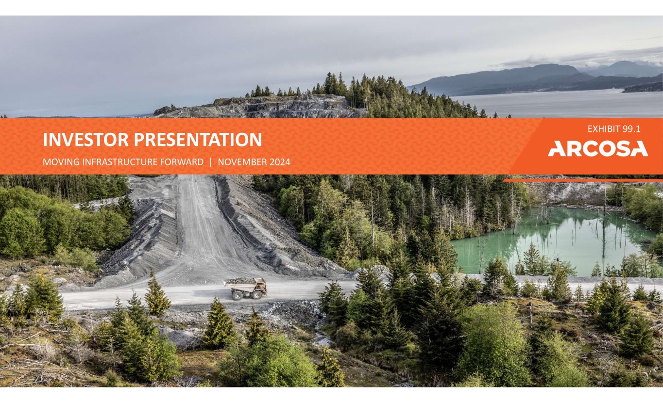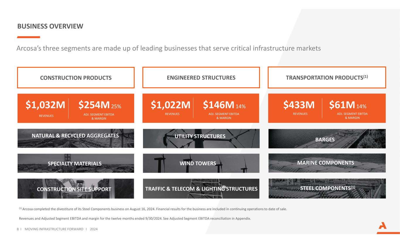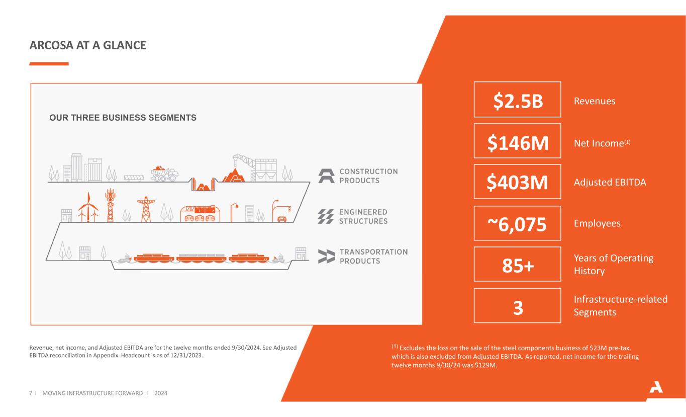 ARCOSA一目了然收入、净收入和调整后EBITDA为截至2024年9月30日的十二个月。见附录中的调整后EBITDA调节。员工人数截至2023年12月31日。净收入(1)调整后EBITDA基础设施相关部门员工多年经营历史我们的三个业务部门收入$ 2.5b $ 1.46亿$ 4.03亿~6,07585 + 37 i moving infrastructure forward i 2024(1)不包括出售钢部件业务的税前亏损$ 2,300万,这也不包括在调整后EBITDA中。据报道,过去12个月的净收入9/30/24为1.29亿美元。