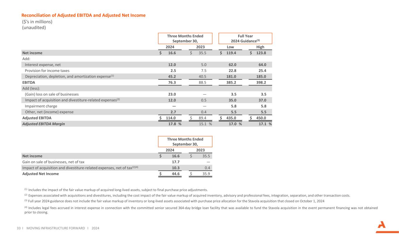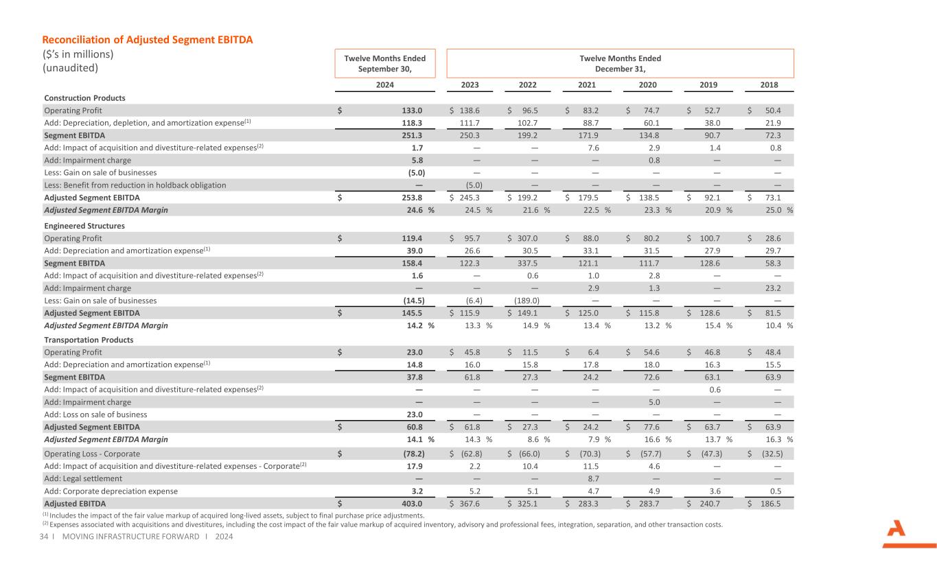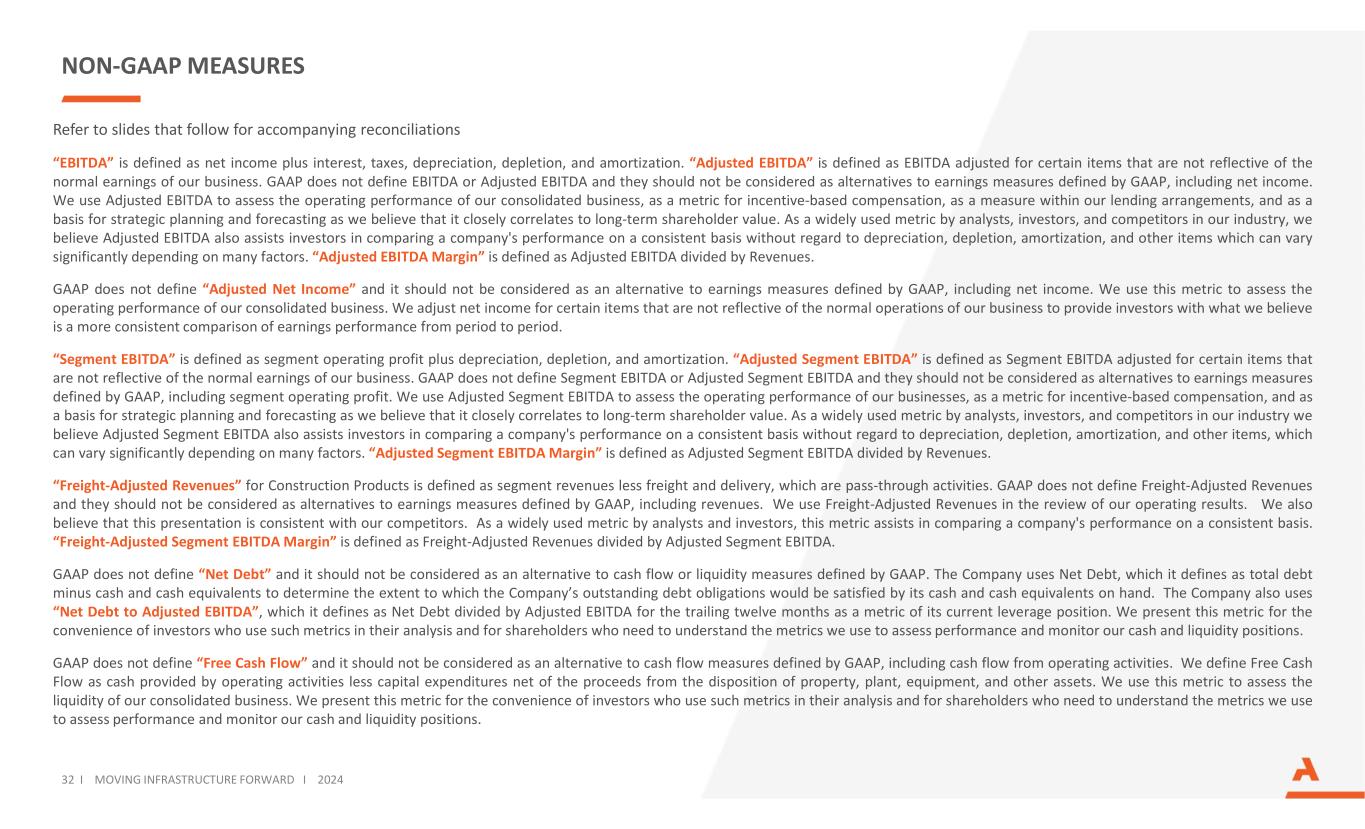 非公认会计准则计量参考随附调节的幻灯片,“EBITDA”定义为净收入加上利息、税收、折旧、损耗和摊销。“调整后EBITDA”定义为对某些项目进行调整后的EBITDA,这些项目不能反映我们业务的正常收益。GAAP没有定义EBITDA或调整后EBITDA,它们不应被视为GAAP定义的收益衡量标准的替代方案,包括净收入。我们使用调整后的EBITDA来评估我们合并业务的经营业绩,作为基于激励的薪酬的衡量标准,作为我们贷款安排中的衡量标准,以及作为战略规划和预测的基础,因为我们认为它与长期股东价值密切相关。作为分析师、投资者和我们行业竞争对手广泛使用的指标,我们认为调整后EBITDA还有助于投资者在不考虑折旧、损耗、摊销和其他可能因许多因素而有显着差异的项目的情况下,在一致的基础上比较公司的业绩。“调整后EBITDA利润率”定义为调整后EBITDA除以收入。GAAP没有定义“调整后净收入”,不应将其视为GAAP定义的收益衡量标准的替代方案,包括净收入。我们使用这一指标来评估我们合并业务的经营业绩。我们对某些项目的净收入进行调整,这些项目不能反映我们业务的正常运营,以便为投资者提供我们认为更一致的不同时期的盈利表现比较。“分部EBITDA”定义为分部营业利润加上折旧、损耗和摊销。“调整后的分部EBITDA”定义为对某些项目进行调整的分部EBITDA,这些项目不能反映我们业务的正常收益。GAAP没有定义分部EBITDA或调整后分部EBITDA,它们不应被视为替代GAAP定义的收益衡量标准,包括分部营业利润。我们使用调整后的分部EBITDA来评估我们业务的经营业绩,作为基于激励的薪酬的衡量标准,并作为战略规划和预测的基础,因为我们认为它与长期股东价值密切相关。作为分析师、投资者和我们行业竞争对手广泛使用的指标,我们认为调整后的分部EBITDA也有助于投资者在不考虑折旧、损耗、摊销和其他项目的情况下,在一致的基础上比较公司的业绩,这可能因许多因素而有很大差异。“调整后分部EBITDA利润率”定义为调整后分部EBITDA除以收入。建筑产品的“运费调整后收入”定义为部门收入减去运费和交付,这是转嫁活动。GAAP没有定义运费调整后的收入,它们不应被视为GAAP定义的收益衡量标准的替代方案,包括收入。我们在审查经营业绩时使用运费调整后的收入。我们还认为,这一演示文稿与我们的竞争对手是一致的。作为分析师和投资者广泛使用的指标,这一指标有助于在一致的基础上比较一家公司的业绩。“运费调整后分部EBITDA利润率”定义为运费调整后收入除以调整后分部EBITDA。GAAP没有定义“净债务”,不应将其视为GAAP定义的现金流或流动性衡量标准的替代方案。该公司使用净债务,其定义为总债务减去现金和现金等价物,以确定公司未偿债务将在多大程度上由其手头的现金和现金等价物来偿还。该公司还使用“净债务与调整后EBITDA”,将其定义为净债务除以过去12个月的调整后EBITDA,作为衡量其当前杠杆状况的指标。我们提出这一指标是为了方便那些在分析中使用此类指标的投资者,以及需要了解我们用来评估业绩和监测我们的现金和流动性头寸的指标的股东。GAAP没有定义“自由现金流”,不应将其视为GAAP定义的现金流量指标的替代方案,包括经营活动产生的现金流量。我们将自由现金流定义为经营活动提供的现金减去处置物业、厂房、设备和其他资产的收益后的资本支出。我们使用这一指标来评估我们合并业务的流动性。我们提出这一指标是为了方便在分析中使用此类指标的投资者,以及需要了解我们用来评估业绩和监测我们的现金和流动性头寸的指标的股东。32 i推动基础设施向前发展i 2024