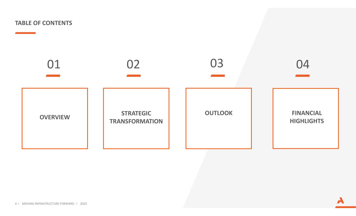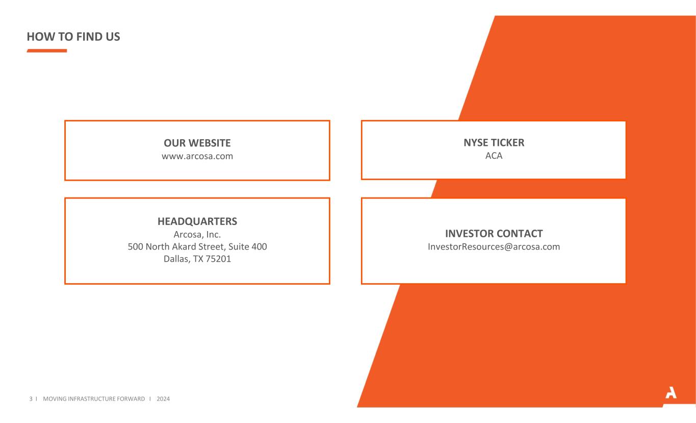 如何找到我们的网站www.arcosa.com NYSE TICKER ACA HeadQUARTERS丨arcosa,Inc. Arcosa, Inc. 500 North Akard Street,Suite 400 Dallas,TX 75201投资者联系方式InvestorResources@arcosa.com 3 i MOVing Infrastructure FORWARD I 2024