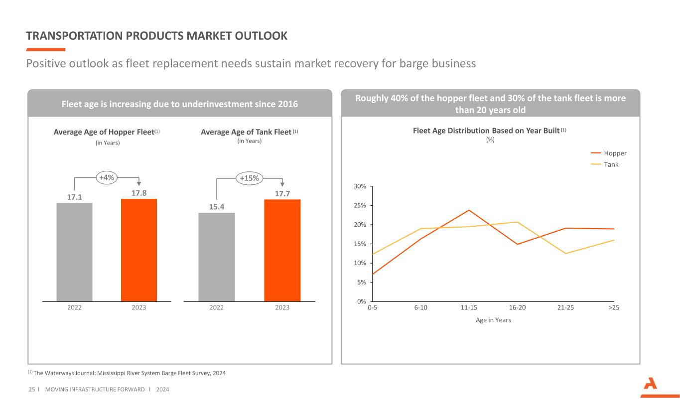 美国和加拿大电力传输总量:报告的CAPEX($ B)运输产品市场前景25 i推动基础设施向前发展i 2024(1)The Waterways Journal:Mississippi River System Barge Fleet Survey,随着船队更换需求维持驳船业务的市场复苏,2024年前景乐观大约40%的漏斗船队和30%的坦克船队的船龄超过20年。美国总计加拿大电力传动:报告CAPEX($ B)车队车龄因2016年以来投资不足而增加17.117.8 20222023 + 4% Hopper车队平均车龄(1)(年)15.4 17.7 20222023 + 15%坦克车队平均车龄(1)(年)0% 5% 10% 15% 20% 25% 30% 0-5 6-10 11-15 16-20 21-25 > 25 Hopper坦克车队车龄分布基于年份建造(1)(%)车龄年