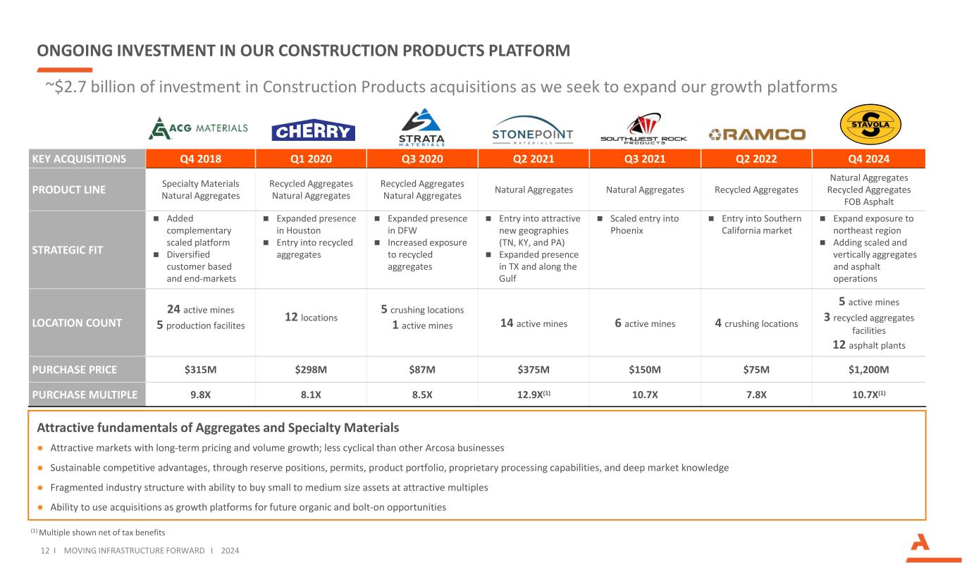 建筑产品33%工程结构38%运输产品29%我们在推进我们的长期愿景11 I Moving Infrastructure Forward I 2024 1Pro Forma 9/30/2024收购Stavola和Ameron以及剥离钢铁部件方面取得了重大进展。见附录汇总中的调整后分部EBITDA对账4~67%调整后EBITDA,不包括企业成本LTM PF12018建筑产品64%工程结构28%反式。产品8%收购建筑产品工程结构剥离钢铁组件2.19亿美元5.57亿美元战略转型