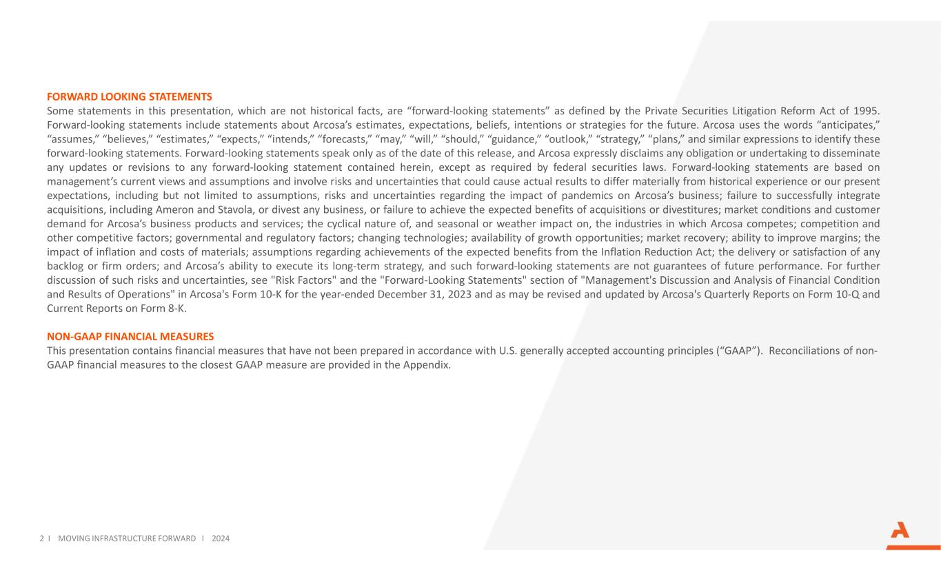 2 I Moving Infrastructure Forward I 2024 Forward Looking Statements本演示文稿中的一些陈述不是历史事实,属于1995年《私人证券诉讼改革法案》所定义的“前瞻性陈述”。前瞻性陈述包括关于Arcosa对未来的估计、期望、信念、意图或战略的陈述。Arcosa使用“预期”、“假设”、“相信”、“估计”、“预期”、“打算”、“预测”、“可能”、“将”、“应该”、“指导”、“展望”、“战略”、“计划”等词语来识别这些前瞻性陈述。前瞻性陈述仅在本新闻稿发布之日起生效,Arcosa明确表示不承担任何义务或承诺传播对此处包含的任何前瞻性陈述的任何更新或修订,除非联邦证券法要求。前瞻性陈述基于管理层当前的观点和假设,涉及可能导致实际结果与历史经验或我们目前的预期存在重大差异的风险和不确定性,包括但不限于有关大流行对Arcosa业务影响的假设、风险和不确定性;未能成功整合收购事项,包括Ameron和Stavola,或剥离任何业务,或未能实现收购或剥离的预期收益;市场条件和客户对Arcosa业务产品和服务的需求;周期性、以及季节性或天气影响,Arcosa竞争的行业;竞争和其他竞争因素;政府和监管因素;不断变化的技术;增长机会的可用性;市场复苏;提高利润率的能力;通货膨胀和材料成本的影响;关于实现《减少通货膨胀法案》预期收益的假设;任何积压或确定订单的交付或满足;以及Arcosa执行其长期战略的能力,此类前瞻性陈述并非对未来业绩的保证。有关此类风险和不确定性的进一步讨论,请参阅Arcosa截至2023年12月31日止年度的10-K表格中“管理层对财务状况和经营业绩的讨论和分析”中的“风险因素”和“前瞻性陈述”部分,该部分可能会由Arcosa的10-Q表格季度报告和8-K表格当前报告进行修订和更新。非公认会计原则财务措施本列报包含未根据美国公认会计原则(“GAAP”)编制的财务措施。附录提供了非GAAP财务指标与最接近的GAAP指标的对账。