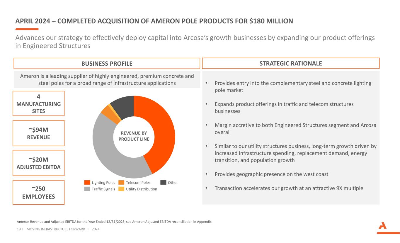 Construction Products Pro Forma1 Construction Products LTM REVENUE LTM Adjusted EBITDA LTM ADJ. EBITDA Margin 24.6% 26.9% $ 254 $ 354 $ 1,032 $ 1,315 Expands Construction Products with High Value-Added Aggregates and a vertically integrated and complementary ASPHALT Operation收购Stavola可增强我们的建筑产品组合的规模和利润率概况17 i Moving Infrastructure Forward I 2024 Aggregates4~56% Asphalt~14% Other2~12%% Revenue Pro Forma1 Portfolio Mix + $ 283见调整后分部EBITDA和Stavola而Stavola 2的LTM 6/30/24包括Arcosa的建筑工地支持业务和Stavola的承包业务57% 19% 14% 0% Other2沥青特种材料骨料100% + $ 100 + 230bps骨料&骨料基76% $ M’s $ M’s