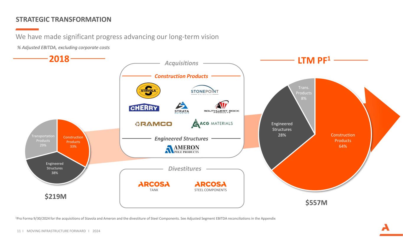 10 i将基础设施向前推进i 2024 ARCOSA的长期愿景降低整体业务的复杂性和周期性将环境、社会和治理(ESG)举措纳入我们的长期战略提高投资资本的长期回报在有吸引力的市场中增长,我们可以在这些市场中实现可持续的竞争优势通过审慎的去杠杆化保持健康的资产负债表
