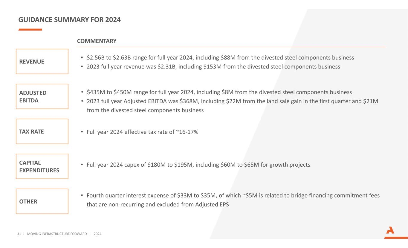 2024年指引摘要调整后EBITDA评论资本支出其他• 2024年全年4.35亿美元至4.5亿美元区间,其中800万美元来自剥离的钢铁部件业务• 2023年全年调整后EBITDA为3.68亿美元,其中2200万美元来自第一季度的土地出售收益,2100万美元来自剥离的钢铁部件业务• 2024年全年资本支出为1.8亿美元至1.95亿美元,其中包括6000万美元至6500万美元用于增长项目的税率•第四季度利息支出为3300万美元至3500万美元,其中约500万美元与非经常性且不包括在调整后每股收益中的过渡性融资承诺费用有关• 2024年全年有效税率约为16-17 %收入• 2024年全年在$ 2.56B至$ 2.63B范围内,包括来自剥离的钢构件业务的8800万美元• 2023年全年收入为$ 2.31B,包括来自剥离的钢构件业务的1.53亿美元31 i moving infrastructure forward i 2024