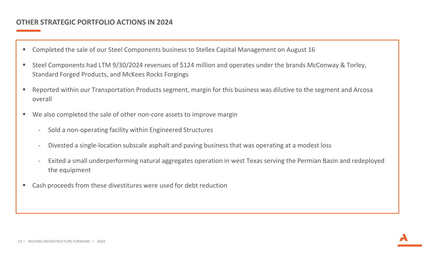 2024年度其他战略投资组合行动19 I Moving Infrastructure Forward I 2024于8月16日完成将我们的钢铁部件业务出售给Stellex Capital Management,Steel Components的LTM 9/30/2024收入为1.24亿美元,并以McConway & Torley、Standard Forged Products和McKees Rocks Forgings品牌运营,在我们的运输产品部门内报告,该业务的利润率稀释了该部门和整体的Arcosa我们还完成了出售其他非核心资产以提高利润率-出售了Engineered Structures内的一家非运营设施-剥离了一家以适度亏损运营的单一地点次尺度沥青和摊铺业务-退出了在德克萨斯州西部服务于二叠纪盆地的一家表现不佳的小型天然骨料业务,并重新部署了这些设备的资产剥离所得现金用于减少债务