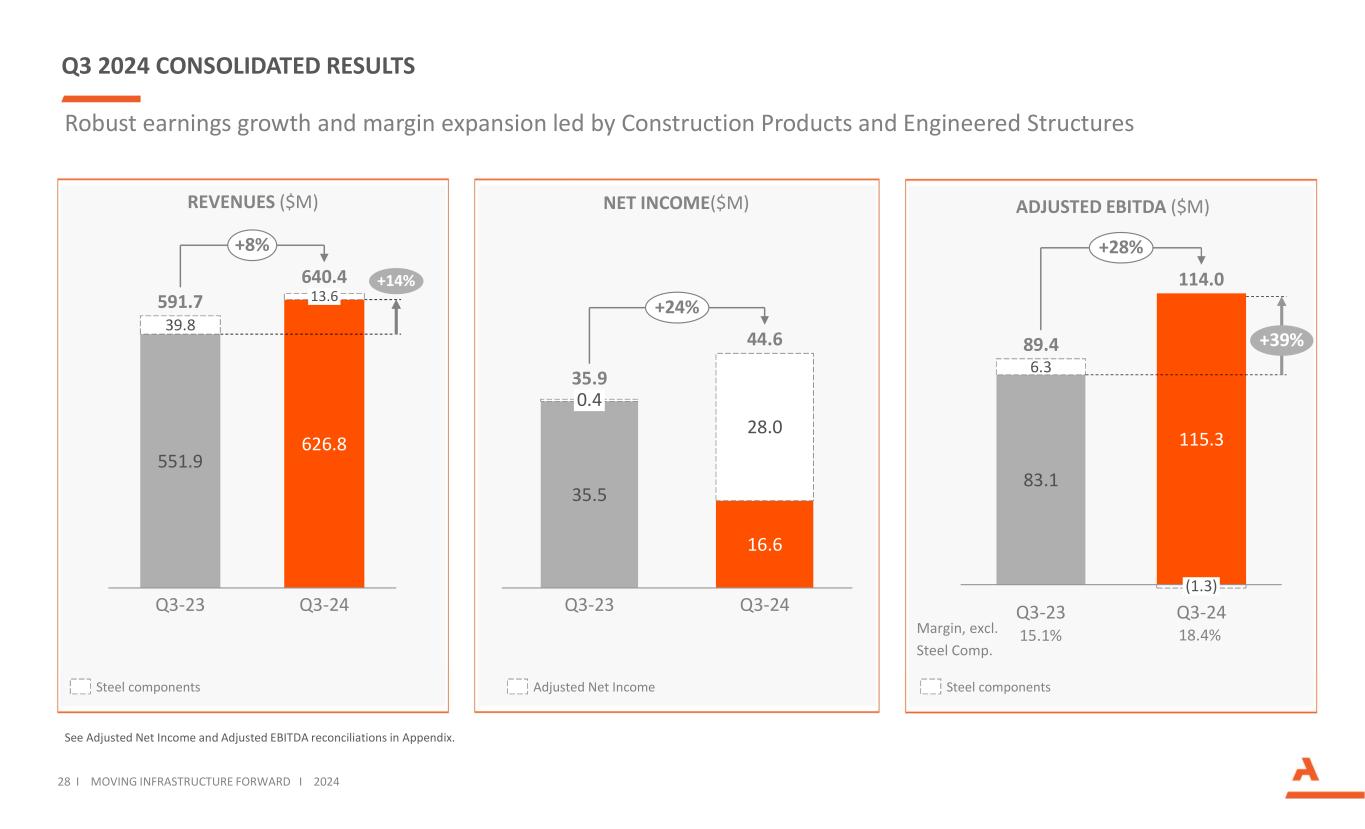 2024年第三季度合并业绩见附录中的调整后净收入和调整后EBITDA对账。收入(百万美元)调整后EBITDA(百万美元)551.96 26.83 9.8 Q3-23 13.6 Q3-24 591.76 40.4 + 14% + 8%净收入(百万美元)强劲的盈利增长和利润率扩张,建筑产品和工程结构28带动了利润率扩张i移动基础设施forward i 202483.11 15.36.3 Q3-23(1.3)Q3-24 89.41 14.0 + 39% + 28%利润率,不包括钢铁公司。15.1% 18.4% 35.5 16.6 28.0 0.4 Q3-23 Q3-24 35.94 4.6 + 24%调整后净收入钢铁零部件钢铁零部件