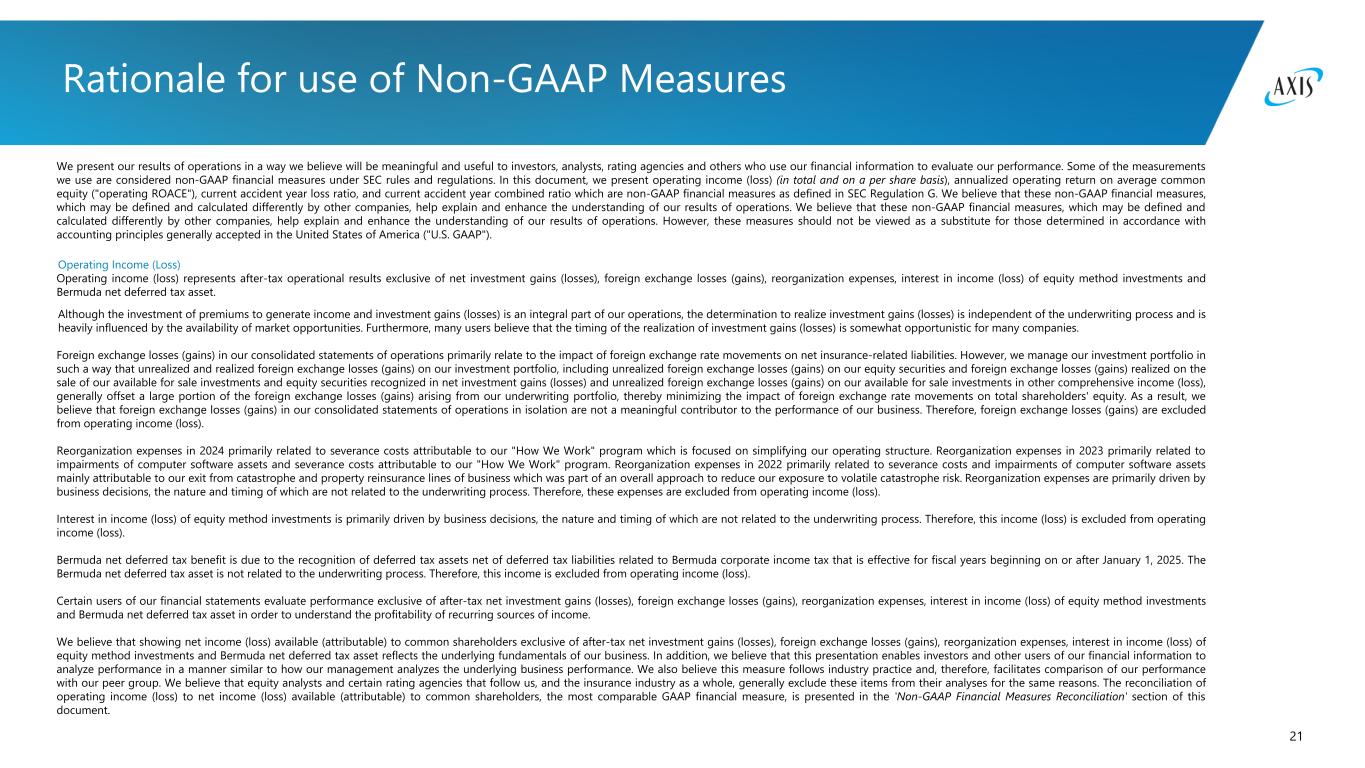 21使用非公认会计原则措施的理由我们以一种我们认为对投资者、分析师、评级机构和其他使用我们的财务信息来评估我们业绩的人有意义和有用的方式展示我们的经营业绩。根据SEC规则和规定,我们使用的一些衡量标准被视为非GAAP财务衡量标准。在本文件中,我们提出了营业收入(亏损)(总额和每股基础)、平均普通股权益的年化营业回报率(“运营ROACE”)、当前事故年度损失率和当前事故年度合并比率,它们是SEC条例G中定义的非GAAP财务指标。我们认为,这些非GAAP财务指标,其他公司可能会以不同的方式定义和计算,有助于解释和增强对我们运营结果的理解。我们认为,这些非GAAP财务指标,可能会被其他公司以不同的方式定义和计算,有助于解释和增强对我们运营结果的理解。然而,这些措施不应被视为替代根据美利坚合众国普遍接受的会计原则(“美国公认会计原则”)确定的措施。营业收入(亏损)营业收入(亏损)指税后经营成果,不包括净投资收益(亏损)、外汇损失(收益)、重组费用、权益法投资的收益利息(亏损)和百慕大递延税项资产净额。虽然保费的投资产生收入和投资收益(亏损)是我们经营的一个组成部分,但实现投资收益(亏损)的决心独立于承保过程,并在很大程度上受到市场机会的可得性的影响。此外,不少用户认为,投资收益(亏损)兑现的时机对很多公司来说,有些机会主义。我们合并经营报表中的外汇损失(收益)主要与外汇汇率变动对与保险相关的净负债的影响有关。然而,我们管理投资组合的方式是,我们的投资组合的未实现和已实现外汇损失(收益),包括我们的股本证券的未实现外汇损失(收益)和出售我们的可供出售投资和股本证券实现的外汇损失(收益)在净投资收益(亏损)中确认,以及我们的可供出售投资在其他综合收益(亏损)中的未实现外汇损失(收益),通常会抵消我们的承销组合产生的大部分外汇损失(收益),从而最大限度地减少外汇汇率变动对股东权益总额的影响。因此,我们认为,孤立地在我们的综合经营报表中的外汇损失(收益)对我们的业务表现不是一个有意义的贡献者。因此,营业收入(亏损)中不包括汇兑损失(收益)。2024年的重组费用主要与归因于我们的“我们如何工作”计划的遣散费有关,该计划的重点是简化我们的运营结构。2023年的重组费用主要与计算机软件资产减值和归属于我们的“我们如何工作”计划的遣散费有关。2022年的重组费用主要与遣散费和计算机软件资产减值有关,主要是由于我们退出了巨灾和财产再保险业务,这是降低我们对波动较大的巨灾风险敞口的整体方法的一部分。重组费用主要由业务决策驱动,其性质和时间与承销过程无关。因此,这些费用不计入营业收入(亏损)。权益法投资的收益(损失)利息主要由商业决策驱动,其性质和时机与承销过程无关。因此,该项收入(亏损)不计入营业收入(亏损)。百慕大净递延税项优惠是由于确认递延税项资产扣除与百慕大公司所得税相关的递延税项负债,自2025年1月1日或之后开始的财政年度生效。百慕大净递延税项资产与承销过程无关。因此,该项收入不计入营业收入(亏损)。我们财务报表的某些用户评估的业绩不包括税后净投资收益(损失)、外汇损失(收益)、重组费用、 权益法投资的收益(亏损)利息和百慕大递延所得税资产净额,以了解经常性收入来源的盈利能力。我们认为,显示普通股股东可获得(归属)的净收益(亏损),不包括税后净投资收益(亏损)、外汇损失(收益)、重组费用、权益法投资的收益利息(亏损)和百慕大递延税项净资产,反映了我们业务的基本面。此外,我们认为,该演示文稿使投资者和我们财务信息的其他用户能够以类似于我们的管理层分析基本业务表现的方式分析业绩。我们还认为,这一衡量标准遵循了行业惯例,因此有助于将我们的业绩与同行进行比较。我们认为,关注我们的股票分析师和某些评级机构,以及整个保险行业,出于同样的原因,一般都会将这些项目排除在分析之外。营业收入(亏损)与普通股股东可得(应占)净收入(亏损)的对账,这是最具可比性的GAAP财务指标,在本文件的“非GAAP财务指标对账”部分中进行了介绍。