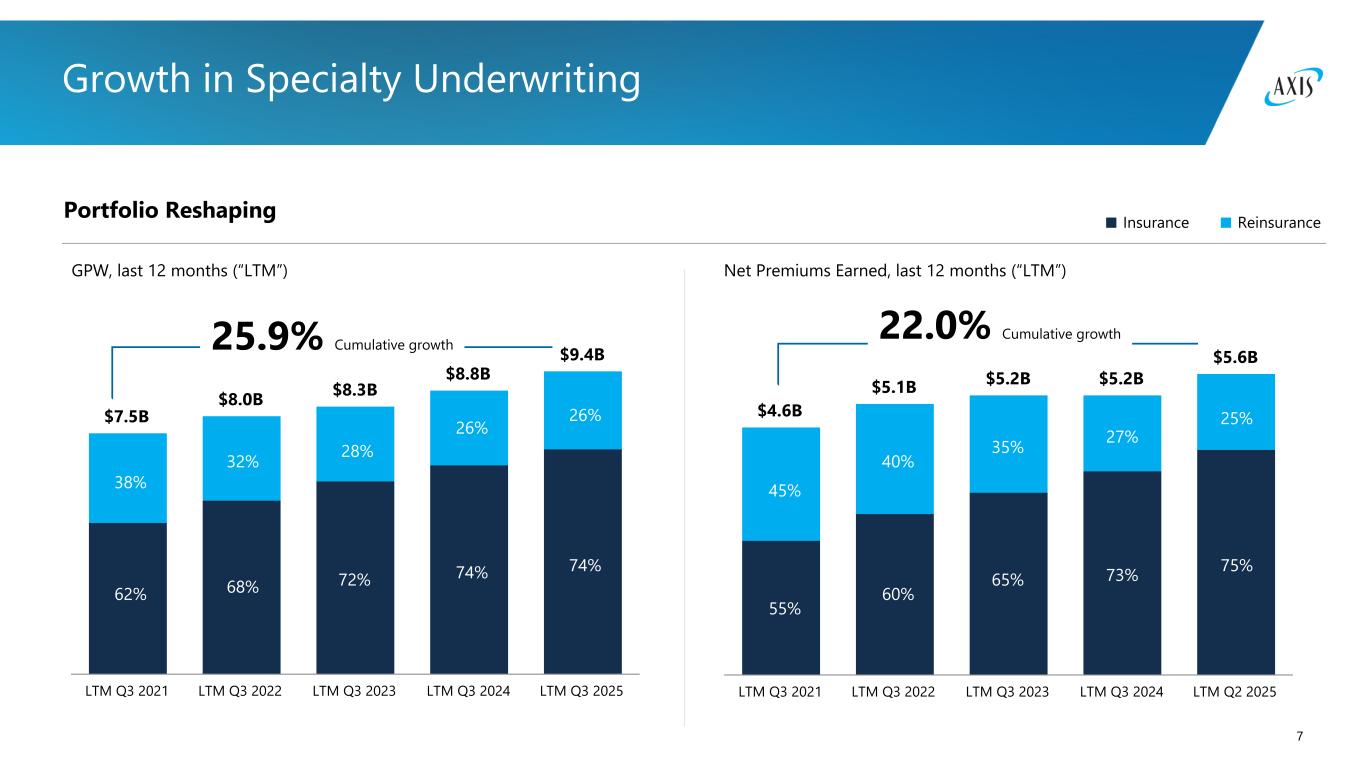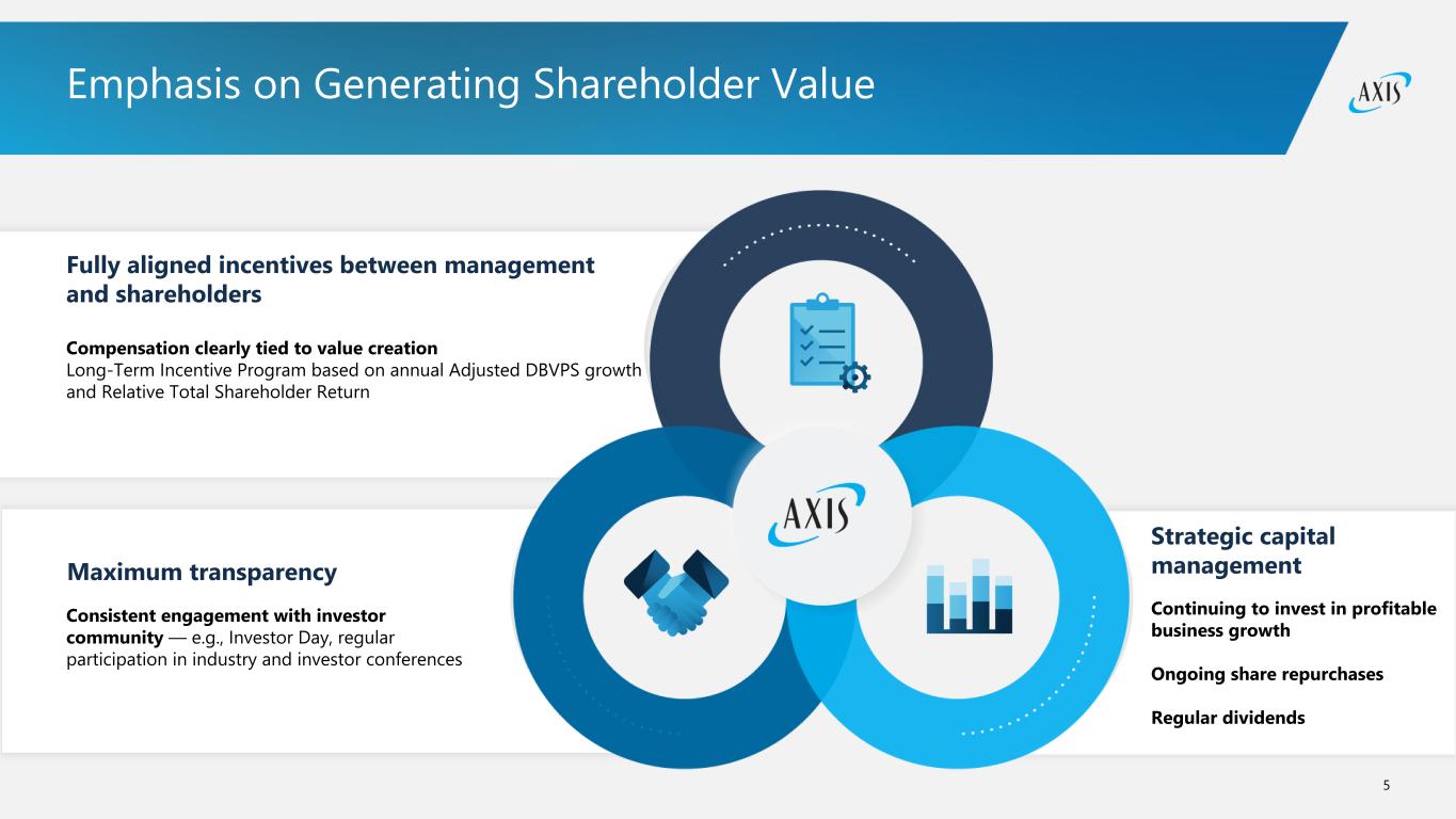 4 AxIS一览我们的战略重点是特殊产品:风险转移解决方案,需要通过差异化的分销渠道和客户资料,由承保专业知识提供定制和量身定制的产品保险再保险保险70亿美元再保险24亿美元94亿美元1创纪录的第三季度运营每股收益3.252美元创纪录的稀释后每股普通股账面价值73.82美元,比过去12个月增长14% 1按细分市场划分的毛保费(“GPW”),截至2025年9月30日的过去十二个月2营业收入(亏损)和每股摊薄普通股营业收入(亏损)是SEC条例G中定义的非GAAP财务指标。与最具可比性的GAAP财务指标、普通股股东可获得的净收入(亏损)和每股摊薄普通股收益(亏损)的对账,以及对这些项目列报理由的讨论将在本文件后面部分提供。3Q25头条新闻74% 26%
