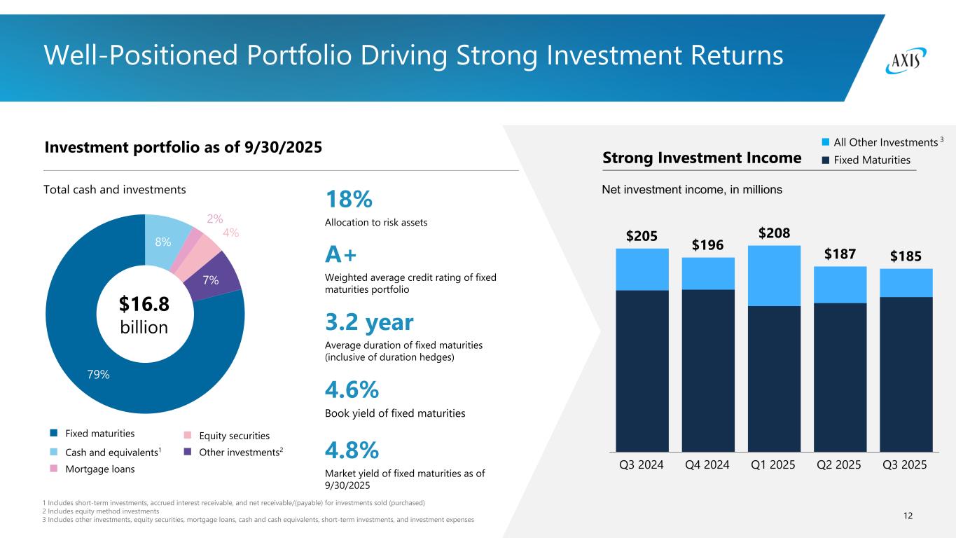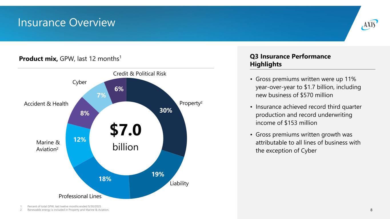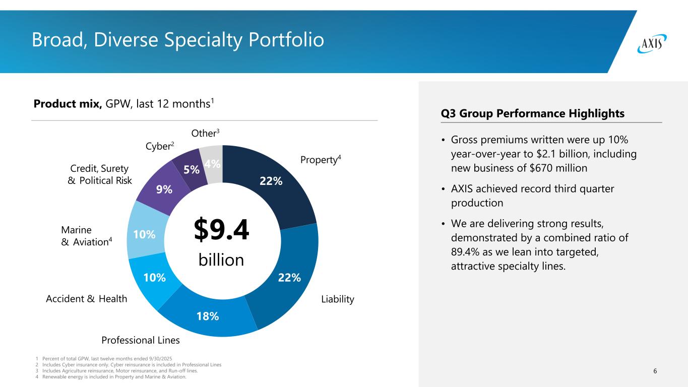 622% 22% 18% 10% 10% 9% 5% 4% 1%的总GDP,截至2025年9月30日止的最后十二个月2仅包括网络保险。网络再保险纳入专业线3包括农业再保险、电机再保险、径流线。4可再生能源被纳入财产和海洋与航空。广泛、多样化的专业组合产品组合,GPW,过去12个月1第三季度集团业绩亮点Property4 Cyber2 Liability Marine & Aviation4 Accident & Health Other3 Credit,Surety & Political Risk 94亿美元•毛保费同比增长10%至21亿美元,其中包括6.7亿美元的新业务• AXIS第三季度实现了创纪录的产量•我们正在交付强劲的业绩,随着我们倾向于有针对性、有吸引力的专业线,综合比率达到89.4%就证明了这一点。专业线