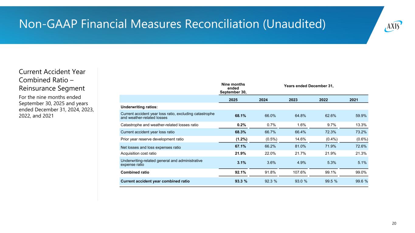 19当前事故年度综合比率–截至2025年9月30日止九个月及截至2024年12月31日止年度的保险分部、2024年度、2023年度、2022年度及2021年度非公认会计原则财务措施对账(未经审计)截至9月30日止九个月、截至2025年12月31日止年度2024202320222021承保比率:当前事故年度赔付率,不含巨灾和天气相关损失52.3% 52.1% 51.8% 51.0% 51.4%巨灾和天气相关损失比率4.1% 5.5% 3.2% 6.5% 6.4%本事故年度损失率56.4% 57.6% 55.0% 57.5% 57.8%上年度准备金开发比率(1.4%)(0.4%)5.1%(0.5%)(0.7%)净损失和损失费用率55.0% 57.2% 57.0% 57.1%购置成本率19.0% 19.5% 18.7% 18.4% 18.3%与承销相关的一般和行政费用率12.0% 12.4% 13.7% 14.2% 16.2%合并比率86.0% 89.1% 92.5% 89.6% 91.6%本事故年度合并比率87.4% 89.5% 87.4% 90.1% 92.3%