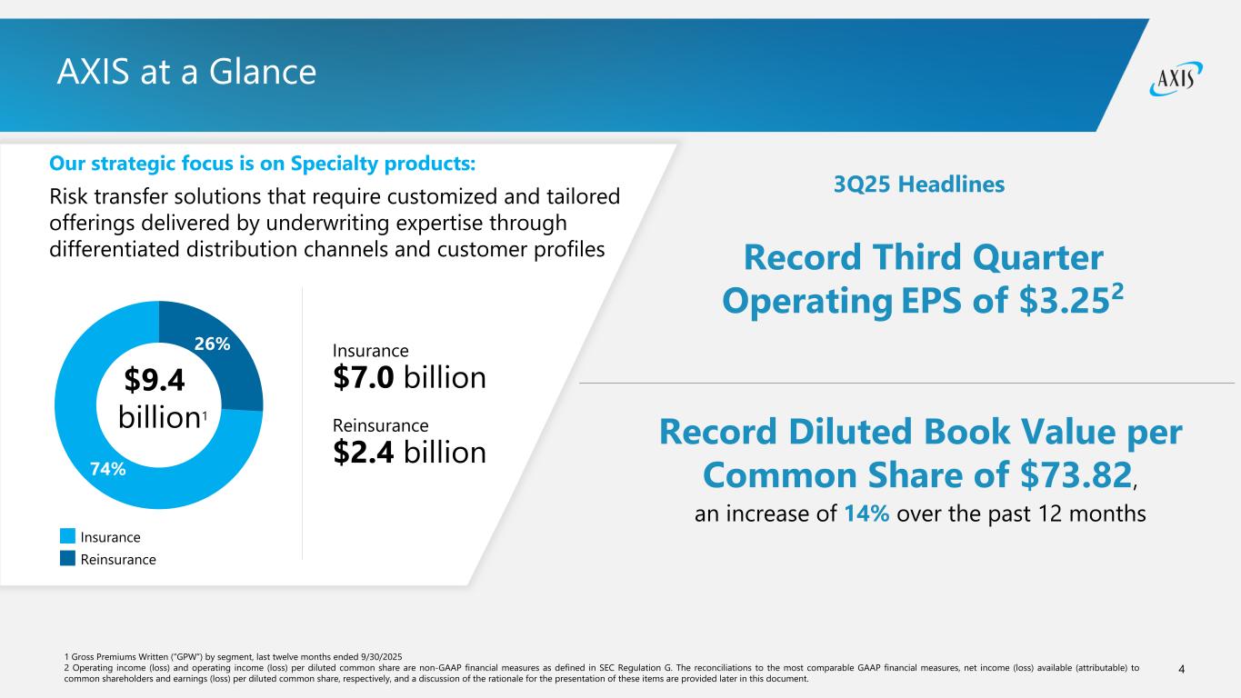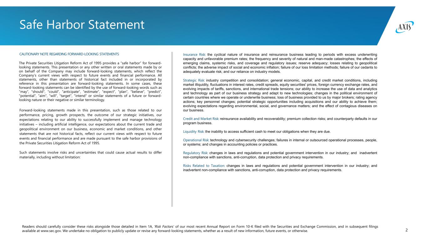 2读者应该仔细考虑这些风险,以及我们最近提交给美国证券交易委员会的10-K表格年度报告的第1a项“风险因素”以及随后可在www.sec.gov上查阅的文件中详述的风险。我们不承担公开更新或修改任何前瞻性陈述的义务,无论是由于新信息、未来事件或其他原因。安全港声明关于前瞻性声明的警示性说明1995年《私人证券诉讼改革法案》为前瞻性声明提供了“安全港”。本演示文稿或由公司或代表公司所作的任何其他书面或口头陈述可能包括前瞻性陈述,这些陈述反映了公司目前对未来事件和财务业绩的看法。除本演示文稿中包含或以引用方式并入的历史事实陈述外,所有陈述均为前瞻性陈述。在某些情况下,这些前瞻性陈述可以通过使用诸如“可能”、“应该”、“可以”、“预期”、“估计”、“预期”、“计划”、“相信”、“预测”、“潜在”、“目标”、“将”、“目标”、“目标”、“打算”或具有未来或前瞻性性质的类似陈述或其负面或类似术语来识别。本演示文稿中所做的前瞻性陈述,例如与我们的业绩、定价、增长前景、我们的战略举措的结果、我们对我们成功实施和管理技术举措的能力的期望——包括人工智能、我们对当前贸易和地缘政治环境对我们的业务、经济和市场状况的期望,以及其他非历史事实的陈述,反映了我们对未来事件和财务业绩的当前看法,并且是根据1995年《私人证券诉讼改革法案》的安全港条款作出的。此类陈述涉及可能导致实际结果出现重大差异的风险和不确定性,包括但不限于:保险风险:保险和再保险业务的周期性导致承保能力过剩和保费率不利的时期;自然和人为灾难的频率和严重程度;新出现的索赔、系统性风险以及承保范围和监管问题的影响;准备金充足性;与地缘政治冲突有关的损失;社会和经济通货膨胀的不利影响;我们的损失限制方法失败;我们的分出人未能充分评估风险;以及我们对行业模型的依赖。战略风险:行业竞争和整合;一般经济、资本和信贷市场状况,包括市场流动性不足、利率波动、信用利差、股本证券价格、外币汇率、关税、制裁的演变影响,和国际贸易紧张局势;我们增加使用数据、分析和技术作为我们业务战略的一部分并适应新技术的能力;我们经营或承销业务的某些国家的政治环境发生变化;主要经纪商向我们提供的业务损失;评级机构行动;关键人事变动;潜在的战略机会,包括收购和我们实现这些机会的能力;对环境、社会和治理事项不断变化的预期;以及传染病对我们业务的影响。信用和市场风险:再保险的可用性和可回收性;保费收取风险;以及我们的程序业务中的交易对手违约。流动性风险:无法在到期时获得足够的现金来履行我们的义务。运营风险:技术和网络安全挑战;内部或外包运营流程、人员或系统出现故障;会计政策或做法发生变化。监管风险:法律法规的变化和政府对我们行业的潜在干预;以及无意中不遵守制裁、反腐败、数据保护和隐私要求。与税收相关的风险:法律法规的变化和政府对我们行业的潜在干预;以及无意中不遵守制裁、反腐败、数据保护和隐私要求。