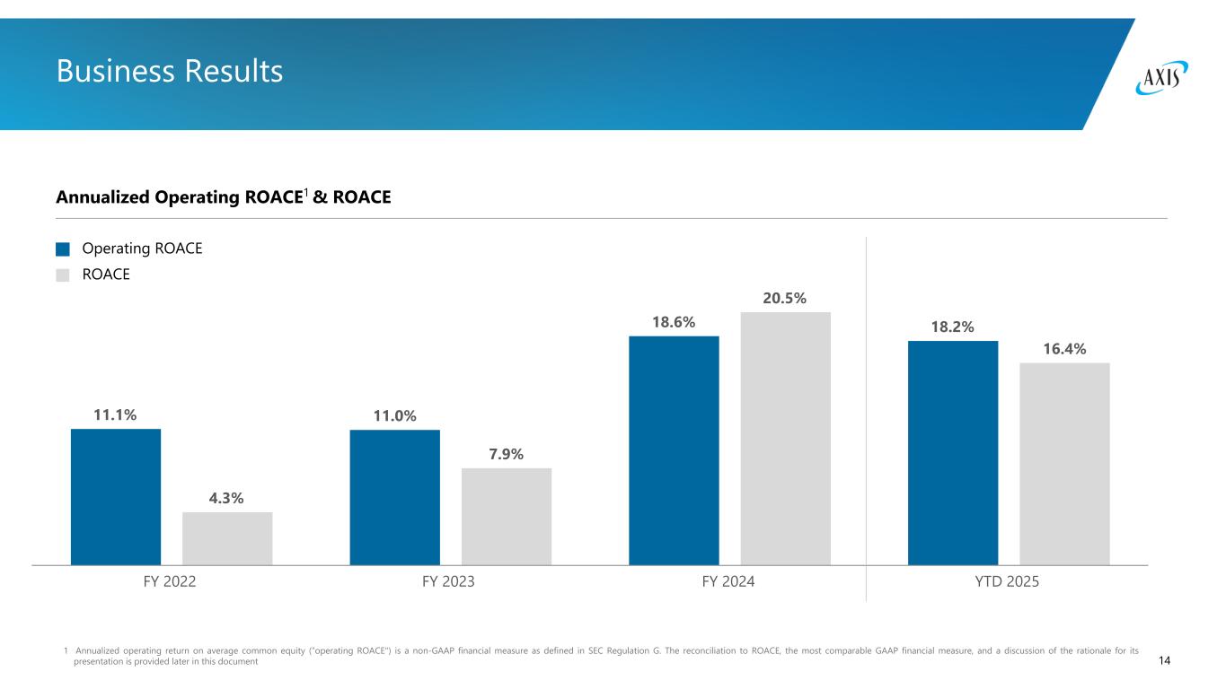 1411.1% 11.0% 18.6% 18.2% 4.3% 7.9% 20.5% 16.4% 2022财年2023财年2024财年年初至今20251平均普通股权益年化经营回报率(“经营性ROACE”)是SEC条例G中定义的非GAAP财务指标。与ROACE(最具可比性的GAAP财务指标)的对账以及对其列报理由的讨论将在本文件后面部分提供业务结果年化经营ROACE1和ROACE经营ROACE ROACE