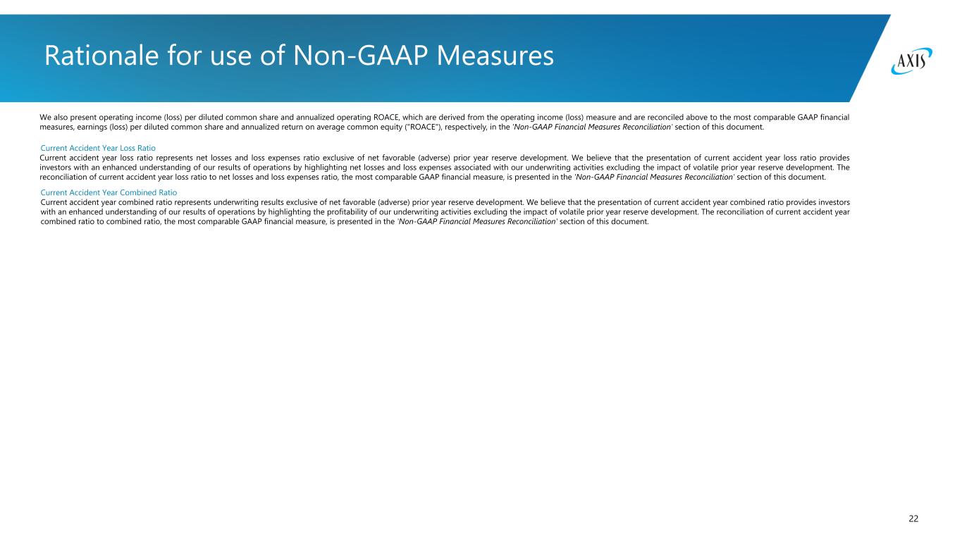 22使用非公认会计原则措施的理由我们还提出了每股稀释普通股的营业收入(亏损)和年化营业ROACE,它们来自营业收入(亏损)措施,并在本文件的“非公认会计原则财务措施调节”部分分别与上述最具可比性的公认会计原则财务措施、每股稀释普通股的收益(亏损)和年化平均普通股权益回报率(“ROACE”)进行了调节。当前事故年度损失率当前事故年度损失率是指不包括净有利(不利)上年度准备金发展的净损失和损失费比率。我们认为,当前事故年度损失率的表述通过突出与我们的承保活动相关的净损失和损失费用(不包括波动的上一年准备金开发的影响),使投资者更好地了解我们的经营业绩。当前事故年度损失率与净损失和损失费用率的对账,这是最具可比性的GAAP财务指标,在本文件的“非GAAP财务指标对账”部分中进行了介绍。当前事故年度综合比率当前事故年度综合比率表示不包括净有利(不利)上年度准备金发展的承保结果。我们认为,当前事故年度综合比率的列报通过突出我们的承保活动的盈利能力(不包括波动的上一年储备开发的影响),使投资者更好地了解我们的经营业绩。当前事故年度合并比率与合并比率的调节,这是最具可比性的GAAP财务指标,在本文件的“非GAAP财务指标调节”部分中进行了介绍。