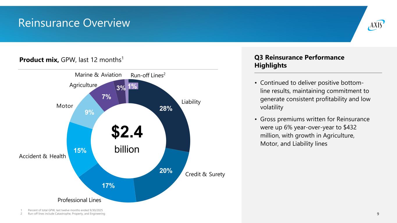 91%的总GDP,截至2025年9月30日的过去12个月2个径流线包括巨灾、财产和工程再保险概览产品组合、GPW,过去12个月1个径流线2Marine & Aviation 28% 20% Credit & Surety Motor 17% Liability 15% Professional Lines 9% 7% Agriculture 24亿美元Accident & Health 3% 1% •继续提供积极的底线结果,保持产生持续盈利能力和低波动性的承诺•为再保险承保的毛保费同比增长6%至4.32亿美元,其中农业、汽车和负债线有所增长Q3再保险业绩亮点